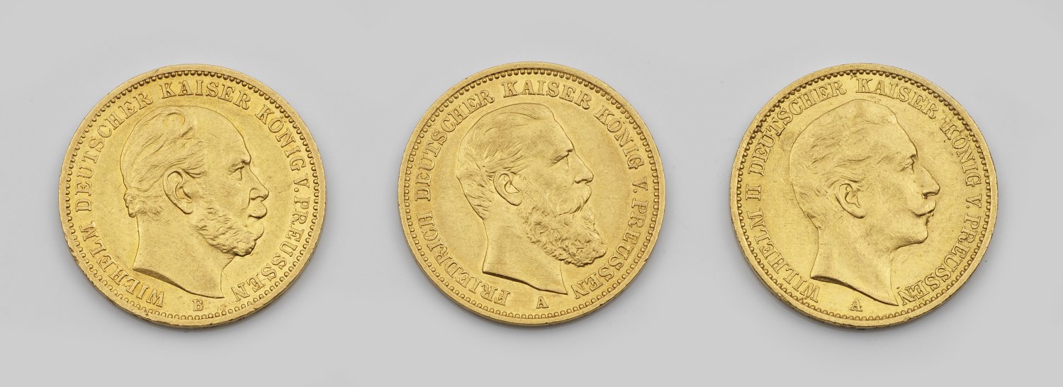 Lot 2321: Drei Goldmünzen "Deutsches Reich, 20 Mark, 1877/1888/1911"