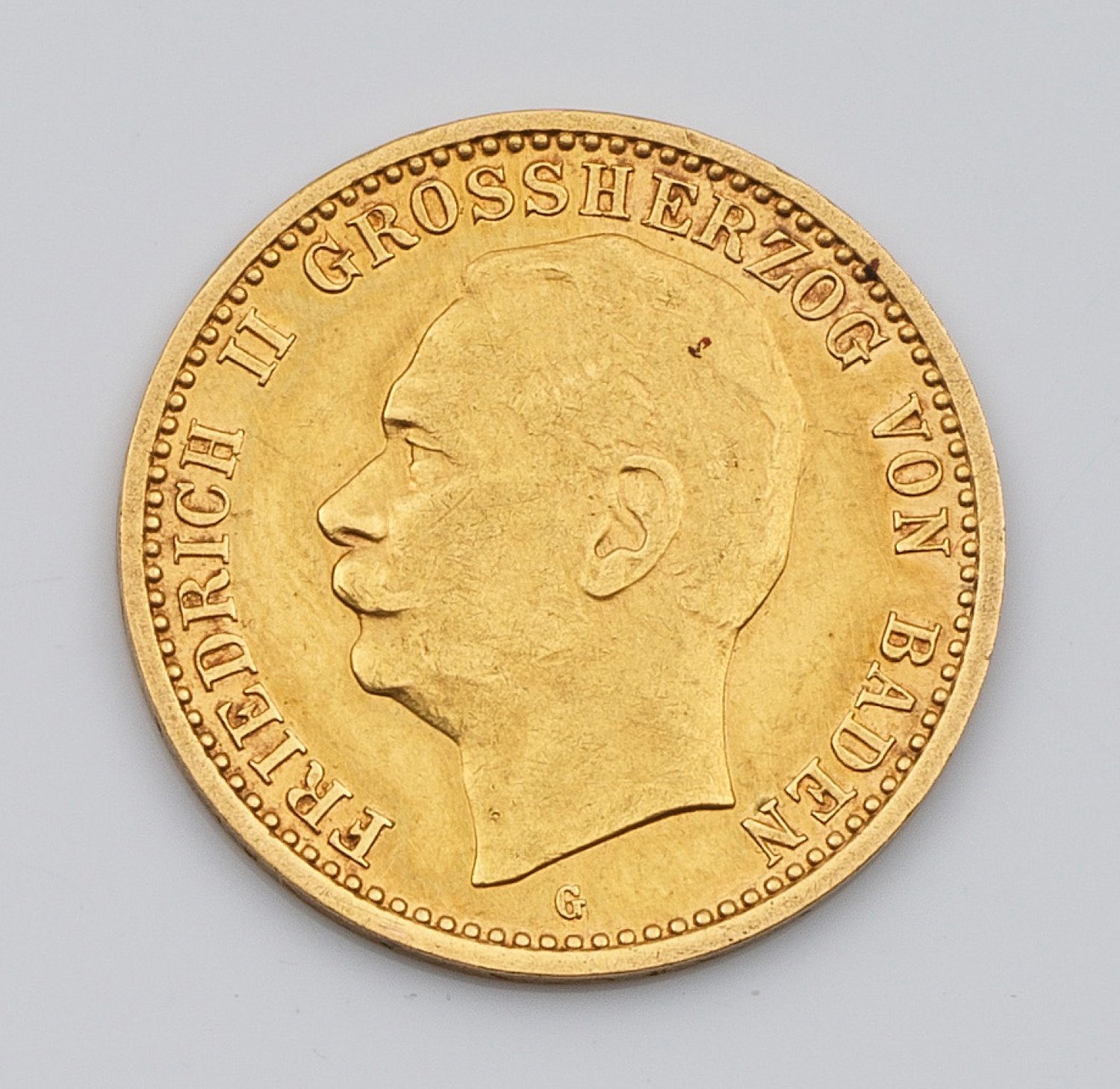 Feingehalt 900. Avers Profilbild von Friedrich II. von Baden mit Umschrift "FRIEDRICH II GROSSHERZOG VON BADEN" und Prägebuchstabe G (Karlsruhe). Revers bekrönter Reichsadler mit Umschrift "DEUTSCHES REICH", Jahreszahl 1909 und Nominal. D. 19,5 mm. Gew. ca. 3,99 g.