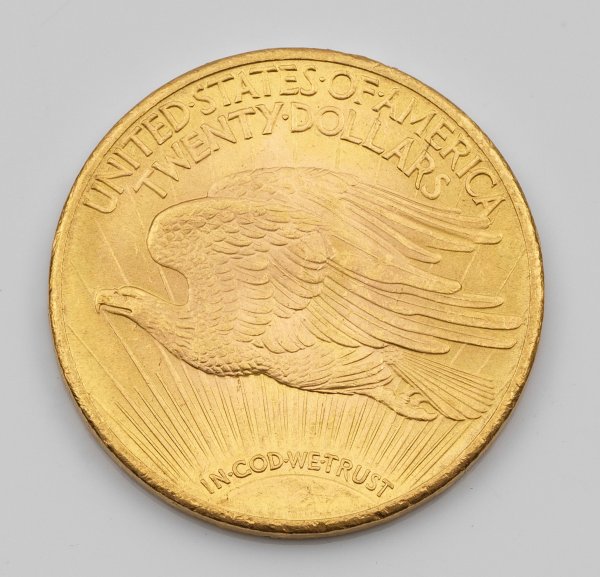 Feingehalt 900. Avers fliegender Adler mit Umschrift "UNITED STATES OF AMERICA", Nominal "TWENTY DOLLARS" und "IN GOD WE TRUST". Revers weibliche Allegorie der Freiheit bez. "LIBERTY" und Jahreszahl 1927. D. 34 mm. Gew. ca. 33,52 g.