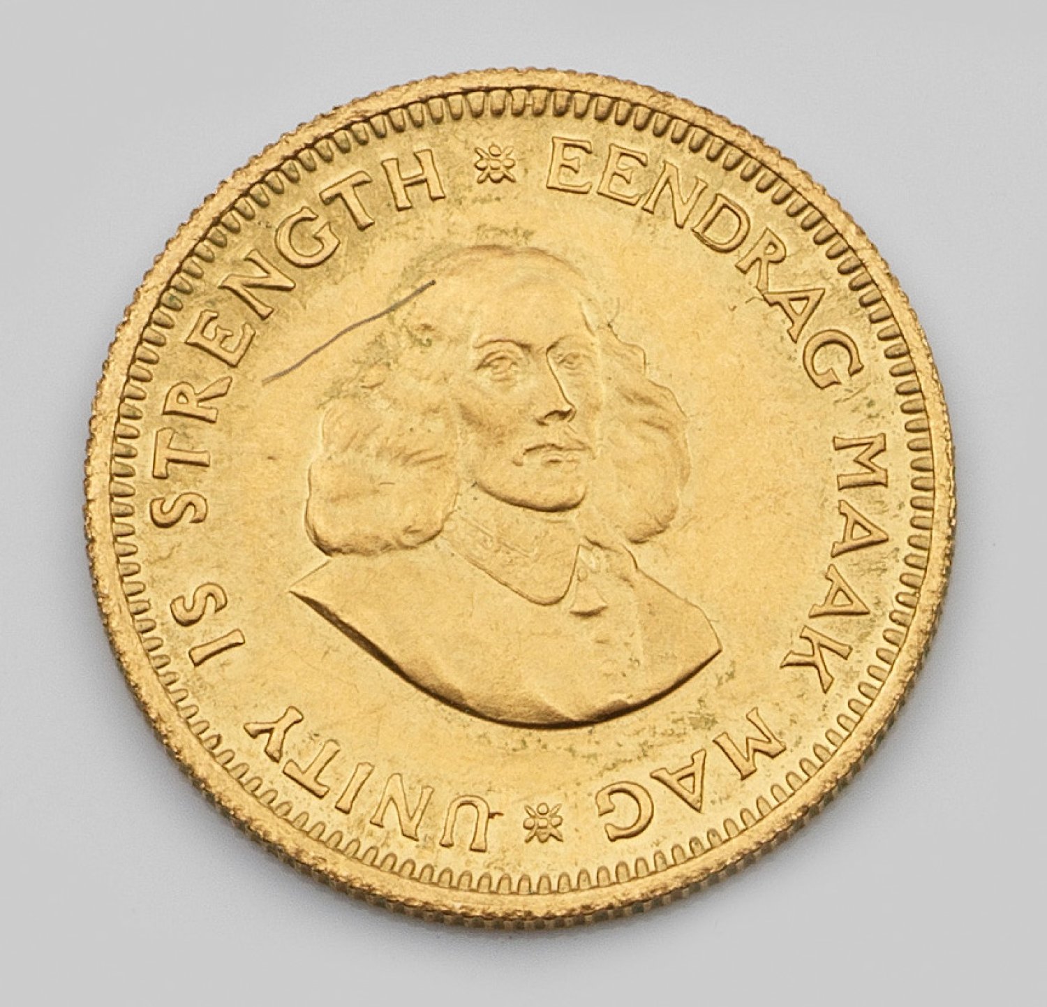 Feingehalt 916. Avers Porträtbüste von Jan van Riebeeck mit Umschrift "UNITY IS STRENGTH" und "EENDRAG MAAK MAG". Revers die Springbockantilope als südafrikanisches Nationaltier mit Nominal, Jahreszahl 1976 und Land. D. 19,5 mm. Gew. ca. 4,00 g.