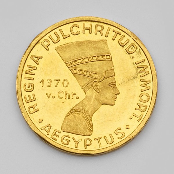 Feingehalt 750. Avers das Profilbild der Nofretete mit Umschrift "REGINA PULCHRITUD. IMMORT. (/) AEGYPTUS" und "1370 v. Chr.". Revers sechs Rosenzweige um ein Monogr. "JB"(?) mit Jahreszahl 1980 und Umschrift "ARTES BONAE ET SCIENTIAE". D. 16 mm. Gew. ca. 1,79 g.