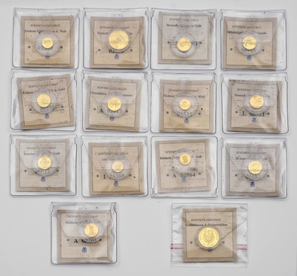 "Liberia, 25 Dollars, Farewell to the Deutsche Mark, 2002" aus der Serie "Die kleinsten Goldmünzen der Welt"; Zwei Medaillen "50 Jahre BRD - Deutsche Währung, 2000"; "Edition 2000 - Chronik der Welt, Wiedervereinigung Deutschlands, 1990"; "Geschichte des Christentums - Benedictus XVI P(ontifex).M(aximus)., 2005"; Zwei Münzen "Liberia, 25 Dollars, Friedrich von Schiller, 2002" aus der Serie "Die kleinsten Goldmünzen der Welt"; "Angela Merkel - 1. Deutsche Bundeskanzlerin, o.J." aus der Serie "Die Bundeskanzler der Bundesrepublik Deutschland"; "Friedrich II. - Der Große, Pro Gloria et Patria, 1994 (Erstausgabejahr)"; "Friedrich II. der Große, o.J."; Zwei Medaillen "Karl der Große 747-814, Heiliges Römisches Reich, o.J."; Münzreplik "Deutsches Reich, 10 Mark, Wilhelm I., 1878/2005"; Münzreplik "Deutsches Reich, 20 Mark, Ludwig II. von Bayern, 1875/2005". D. 11-20 mm; Ges.-Gew. ca. 21,55 g.
