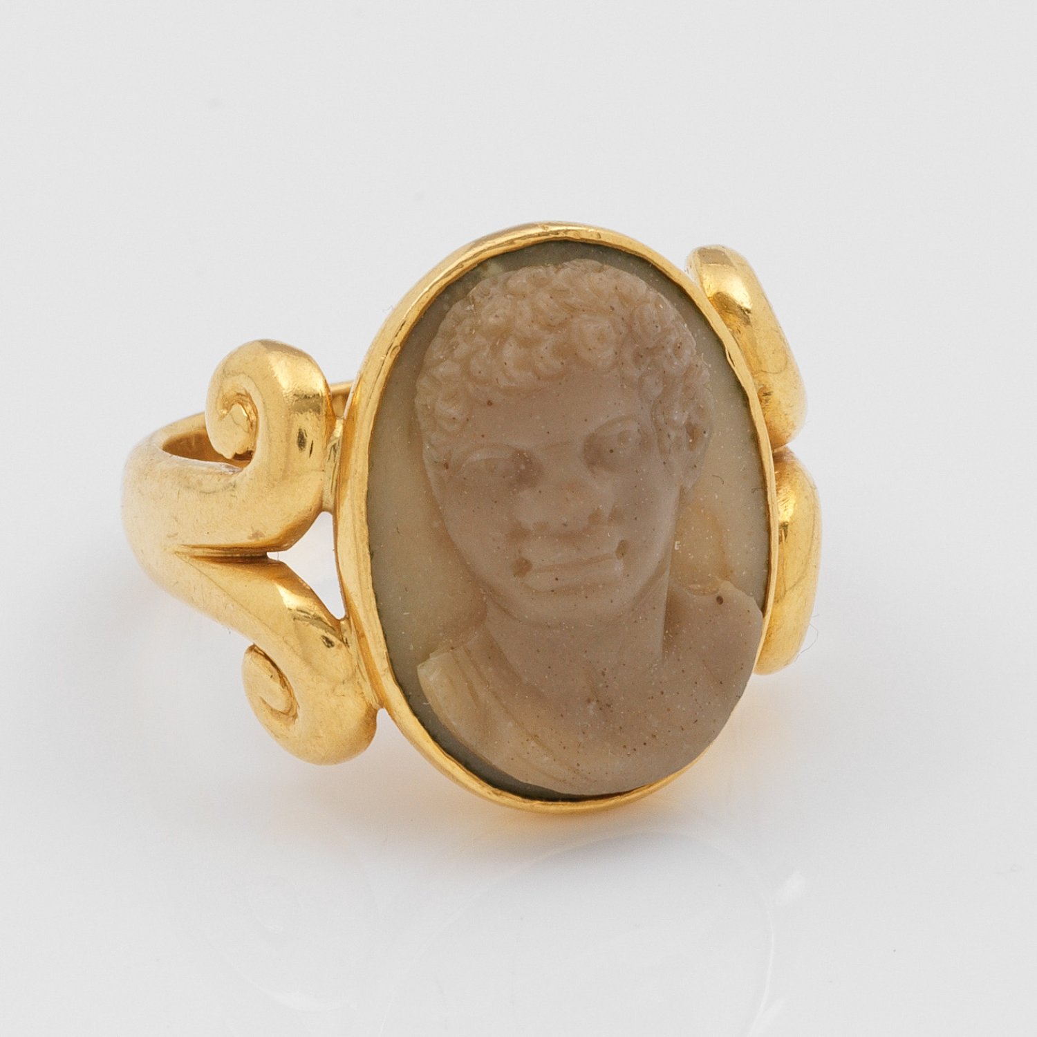 Gelbgold, 21,6 k. Zentral besetzt mit einem im Relief erhaben geschnittenem Mohrenkopf. Feine Goldschmiedeausführung. Gew. ca. 17,8 g.