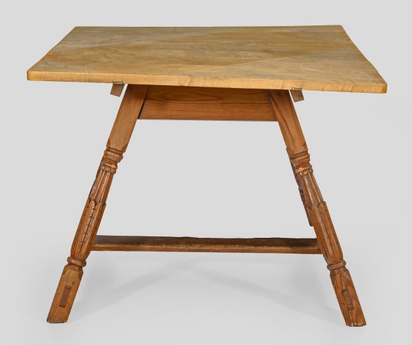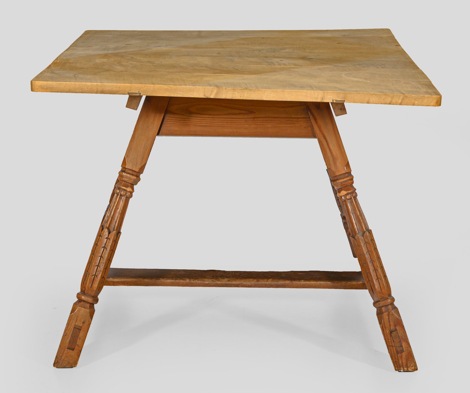 Weichholz und Ahorn. Breite Zarge auf schräggestellten Balusterbeinen, unterhalb durch gekantete Stege verbunden. Weit überstehende, quadratische Deckplatte. H. 75 cm. 100 cm x 98 cm.