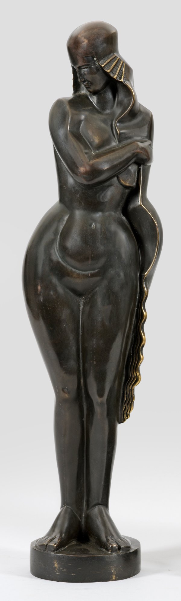 Bronze, dunkel patiniert. Posthumer, zeitgenössischer Guss, 21. Jh., nach dem um 1930 entstandenen Original. Die Zwillinge Jean und Joël Martel gehören zu den bedeutendsten französischen Bildhauern im 2. Viertel des 20. Jhs.; Sie schufen Skulpturen, Reliefs, Denkmäler und Brunnen im Stil des Art Déco oder des Kubismus; in den 1920er Jahren entwarfen sie auch Ausstattungen und Interieurs für Villen, teilw. in Zusammenarbeit mit Jean Prouvé und Charlotte Perriand. Sie teilten sich das gleiche Atelier und arbeiteten so eng zusammen, dass sie schließlich nur noch mit "Martel" signierten. Die Martel-Brüder nahmen an Pariser Ausstellungen im Salon des Indépendants, dem Salon d'Automne, dem Salon des Tuileries und der Exposition of Decorative Arts von 1925 teil. H. 63,7 cm.