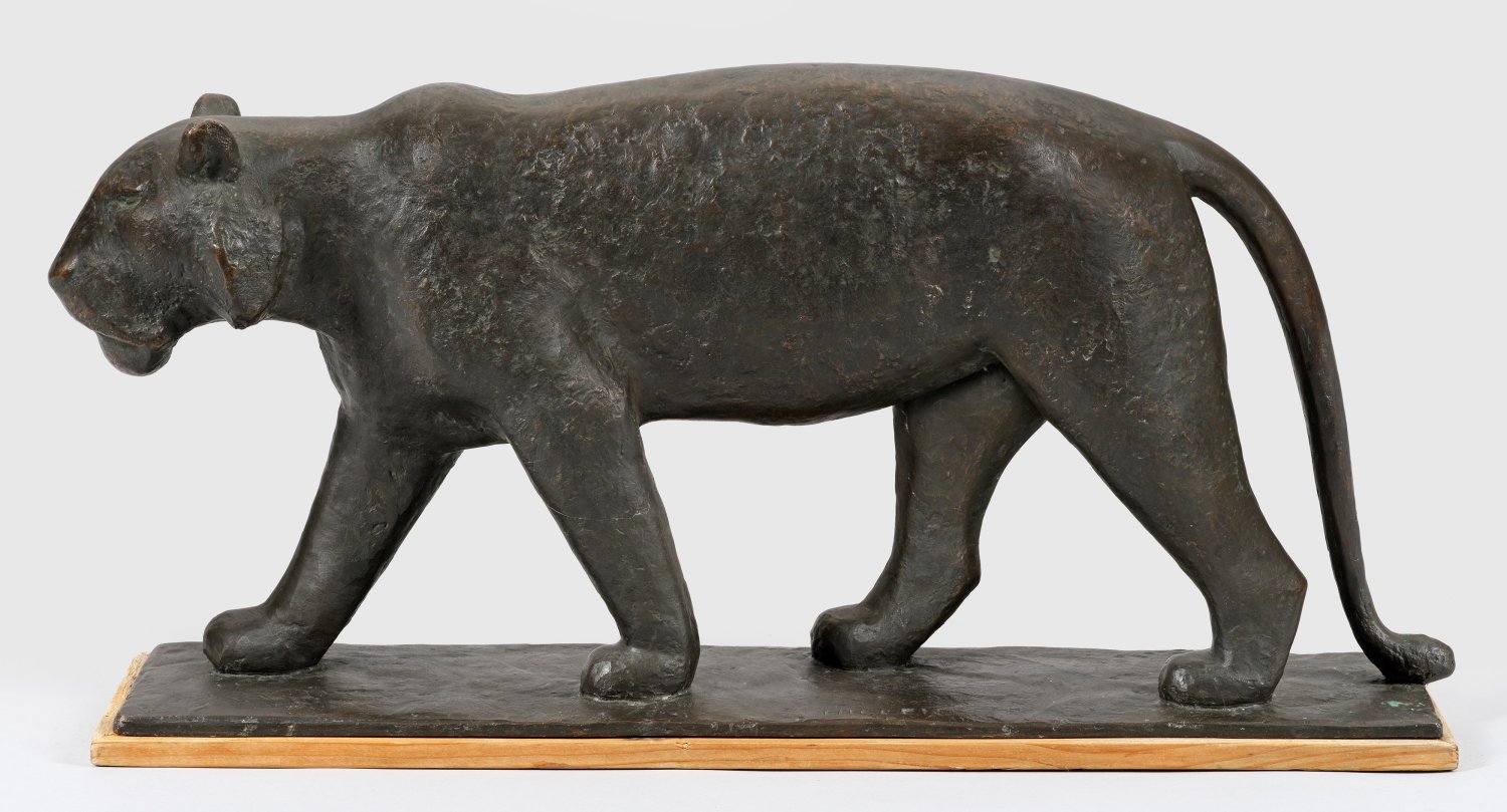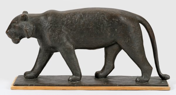 Bronze, dunkel patiniert. Sign.; Auf das Wesentliche reduzierte, von Fritz Behn beeinflusste Tierplastik Hillers. Hiller erhielt eine gründliche künstlerisch-bildhauerische Ausbildung: er studierte nach einer Holzbildhauerlehre 1913-1923 an der Münchener Akademie bei Hermann Hahn (unterbrochen vom I. Weltkrieg), zudem bildete sich Hiller in den Ateliers von Fritz Behn, Wilhelm Nida-Rümelin, Josef Flossmann und Karl Killer. Hiller wurde Mitglied der "Münchener Secession", arbeitete seit 1923 freischaffend, 1926 führte ihn ein Studienaufenthalt nach Paris. Kurz danach erschien im Jahr 1928 in der Zeitschrift "Der Kunstwart (S. 278) ein Artikel über Hiller, in der er "als einer der hoffnungsvollsten jüngeren Bildhauer" gelobt wird, dem "ein sicheres Gefühl für den Stoff" eigen sei. In der Zeit des Nationalsozialismus beteiligte sich Hiller 1933 an der Ersten Staatlichen Kunstausstellung in München, 1938, 1940 und 1941 war er mit insgesamt fünf Arbeiten auf der Großen Deutschen Kunstausstellung in München vertreten. 1946-1961 lehrte er als Professor für Bildhauerei an der Akademie für Bildende Künste in München. Neben Toni Stadler und Heinrich Kirchner war Hiller der wichtigste Vertreter der Münchner Bildhauerschule im dritten Viertel des 20. Jhs.; Von 1952 bis 1960 war Hiller Vorstandsmitglied im Deutschen Künstlerbund. 1961 ernannte man Hiller zum Ehrenmitglied der Münchener Akademie, 1962 war er Ehrengast der Deutschen Akademie der Villa Massimo in Rom. 1973 fand eine große Retrospektive in der Städtischen Galerie im Lenbachhaus in München statt. 27 cm x 59 cm x 11,8 cm.