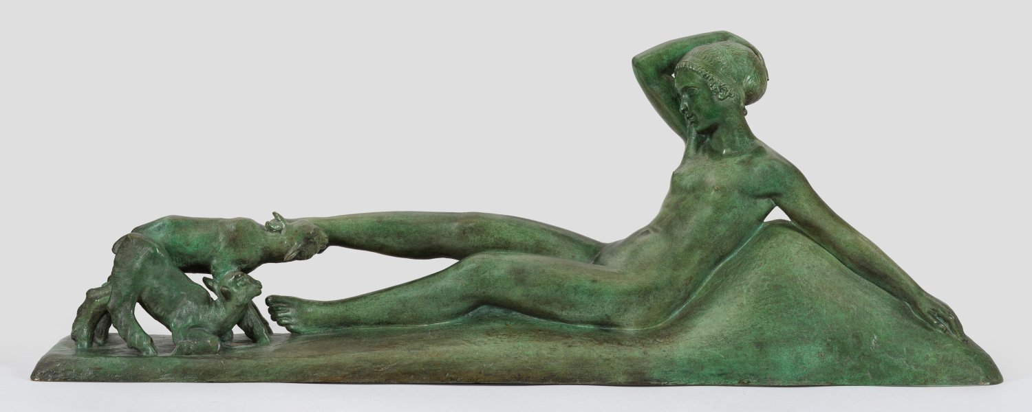 Bronze grün patiniert. Sign. "G. Gori" u. bez. "Lapointe Editeur (/) cire perdue". Um 1930 entstandene Art Déco-Figurengruppe. Gori, Sohn italienischer Eltern, war Schüler der Bildhauer Jean-Antoine Injalbert und Henri Bouchard. Seit 1929 stellte er auf den Pariser Salons der Société des Artistes Français aus, deren Mitglied er von circa 1932 bis 1939 war; auf der Weltausstellung Paris 1937 erhielt er für seine Figurengruppe "La Promenade" eine Goldmedaille. H. 28 cm; B. 78 cm.