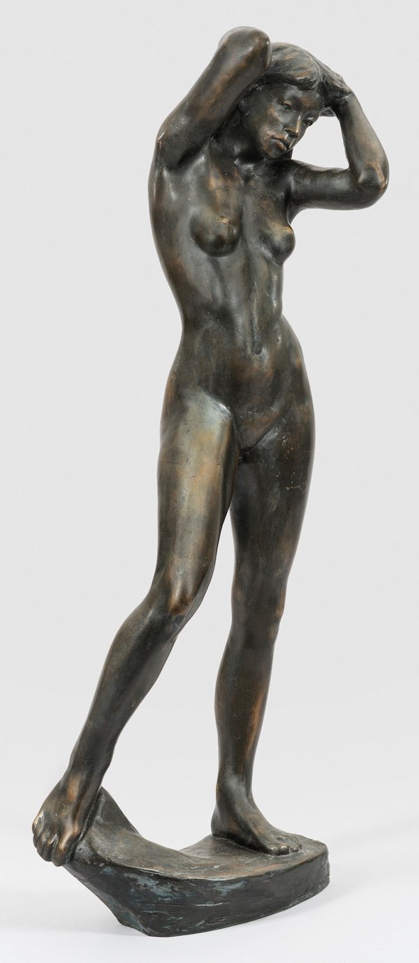 Bronze, dunkel patiniert, 1980. Sign. u. dat.; Große Bronzeplastik mit der Darstellung einer jungen Frau in lasziv-legerer Pose, die sich mit den Händen in ihr langes Haar greift. Eibl arbeitete als Keramiker und Bildhauer in den verschiedensten Techniken, betrieb eine eigene Schmiede, Keramikwerkstatt und Bronzegießerei. Zu den vergleichbaren Arbeiten Eibls zählt seine Aktstatue "Frühling" im Park vor der Ferdinandquelle in Marienbad. H. 100 cm.