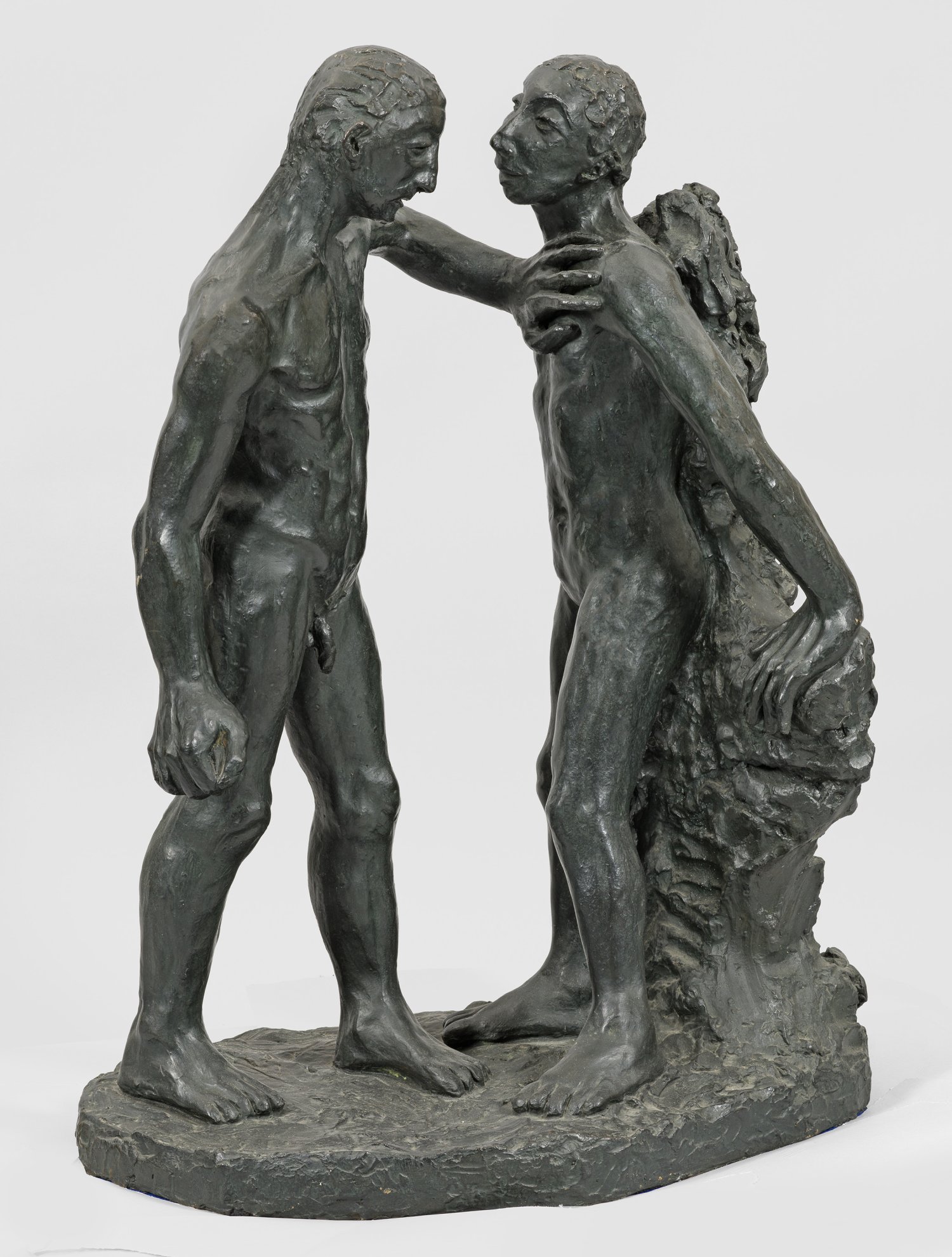 Bronze patiniert. Sign. mit Ligatur-Monogramm "MB". Guss von Susse Fondeur Paris (mit Gießerinschrift). Große Bronzegruppe des bedeutenden, modernen, dänischen Bildhauers, der wohl als Gegenstück auch "Adam und Eva" schuf und vor allem für seine Tierfiguren, Brunnen und Denkmäler bekannt ist. Boggild studierte an der Königlich Dänischen Kunstakademie in Kopenhagen. Seit 1936 schuf er viele Arbeiten für den öffentlichen Raum, u. a. in Nykøbing Falster, Aarhus, Hillerød, Kopenhagen und Glostrup (wo die stilistisch vergleiche Gruppe "To søstre"/"Zwei Schwestern" von 1963-1977 steht). Von 1955 bis 1971 war Boggild Professor für Bildhauerei an der Akademie in Kopenhagen. Bøggild wurde 1930 mit der Eckersberg-Medaille und 1940 mit der Thorvaldsen-Medaille ausgezeichnet. 2013 veranstaltete das Thorvaldsen-Museum eine Ausstellung mit Bøggilds Werken. Ca. 82 cm x 64 cm x 38,5 cm.