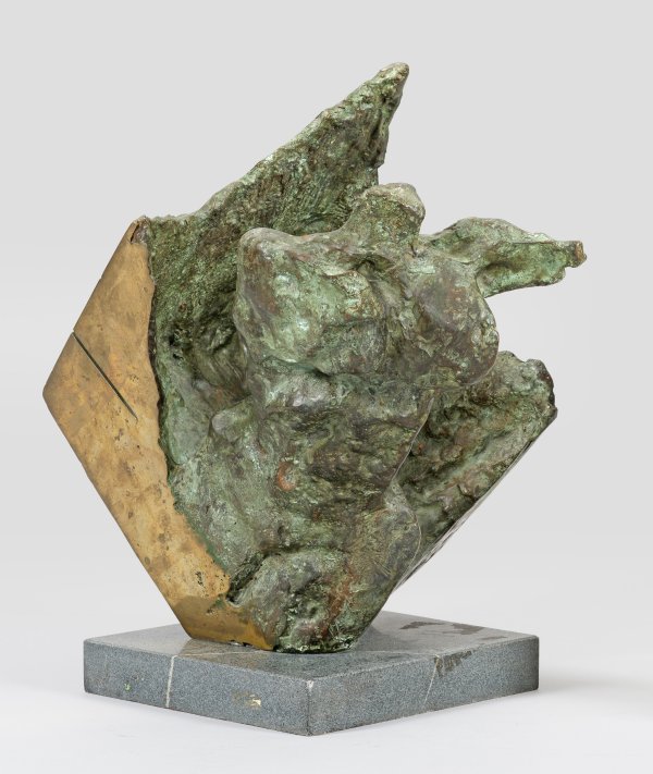 Bronze, in nuancierten, dunklen und grünen Tönen patiniert, der Würfel außen poliert; graue, quadratische Marmorplinthe. Monogr.; Ges.-H. 39 cm.