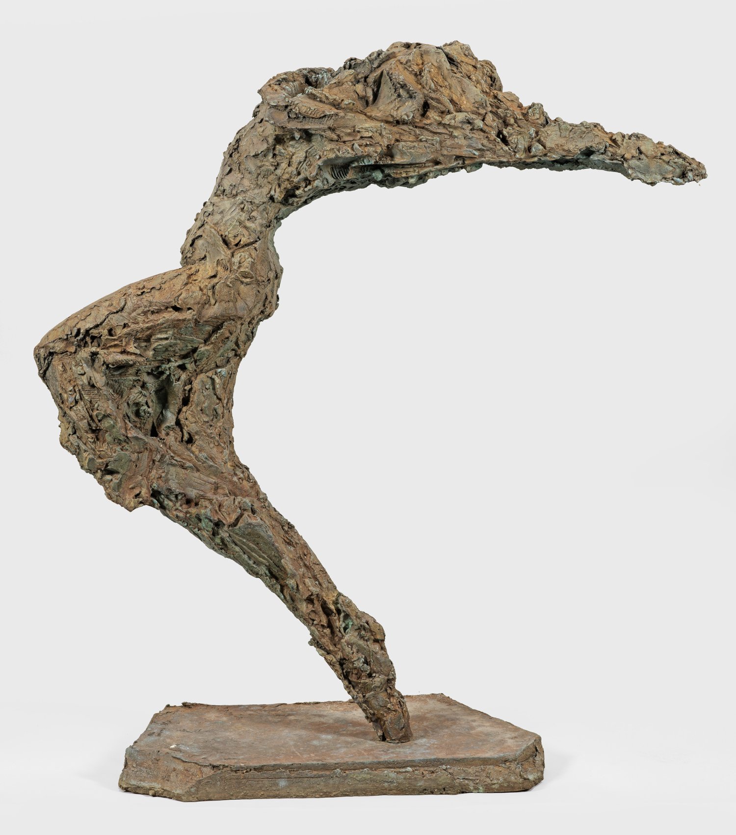 Bronze, dunkel patiniert, 1991/1992. Sign., dat. u. nummeriert 3/6. Auf einer unregelmäßig gekanteten, einer Steinplatte ähnelnden Plinthe stehende(r) Tänzerin oder Tänzer, bei der die Beine, Kleidung und Körper mit dem nach hinten gestreckten Kopf und den waagerechten Armen zu einem einzigen Spannungsbogen verschmolzen sind. In Motiv und Stil charakteristische Plastik Oswalds, bei der Darstellung der menschlichen Figur zwischen Figuration und Abstraktion unmittelbar aus dem Schaffensprozess des Modells stammt. Die Expressivität steigert Oswald durch die für ihn charakteristische stark belebte, reliefierte, raue Oberfläche. Oswald absolvierte 1981-1990 ein Bildhauerstudium in Mainz bei Werner Durth, Heinz Hemrich und Peter Lörincz. Schon 1985 erhielt er für seine Arbeiten den Daniel-Henry-Kahnweiler-Preis, dem zahlreiche Auszeichnungen und Ausstellungen folgten. Außer kleineren Werken schuf er zahlreiche Arbeiten für öffentliche Räume, Plätze und Parks. Ein Schwerpunkt seines Schaffens sind Tänzer, für die er intensive Studien bei Tanzkompanien betrieb. H. 106 cm.