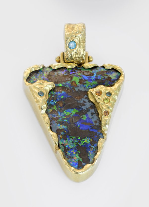 Pendant set with a matrix opal and small tourmalines, in 18 k gold. Maker's mark.