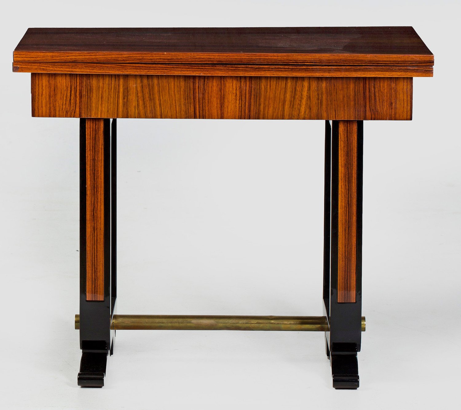 Palisander furniert, Schwarzlack und Messing. Über flachen Volutenfüßen gekantete Streben als Träger für rechteckigen Zargenkasten, unterhalb durch Rundstab verbunden. Rechteckige, aufklappbare Deckplatte. H. 75 cm. 90 cm x 60/120 cm.
