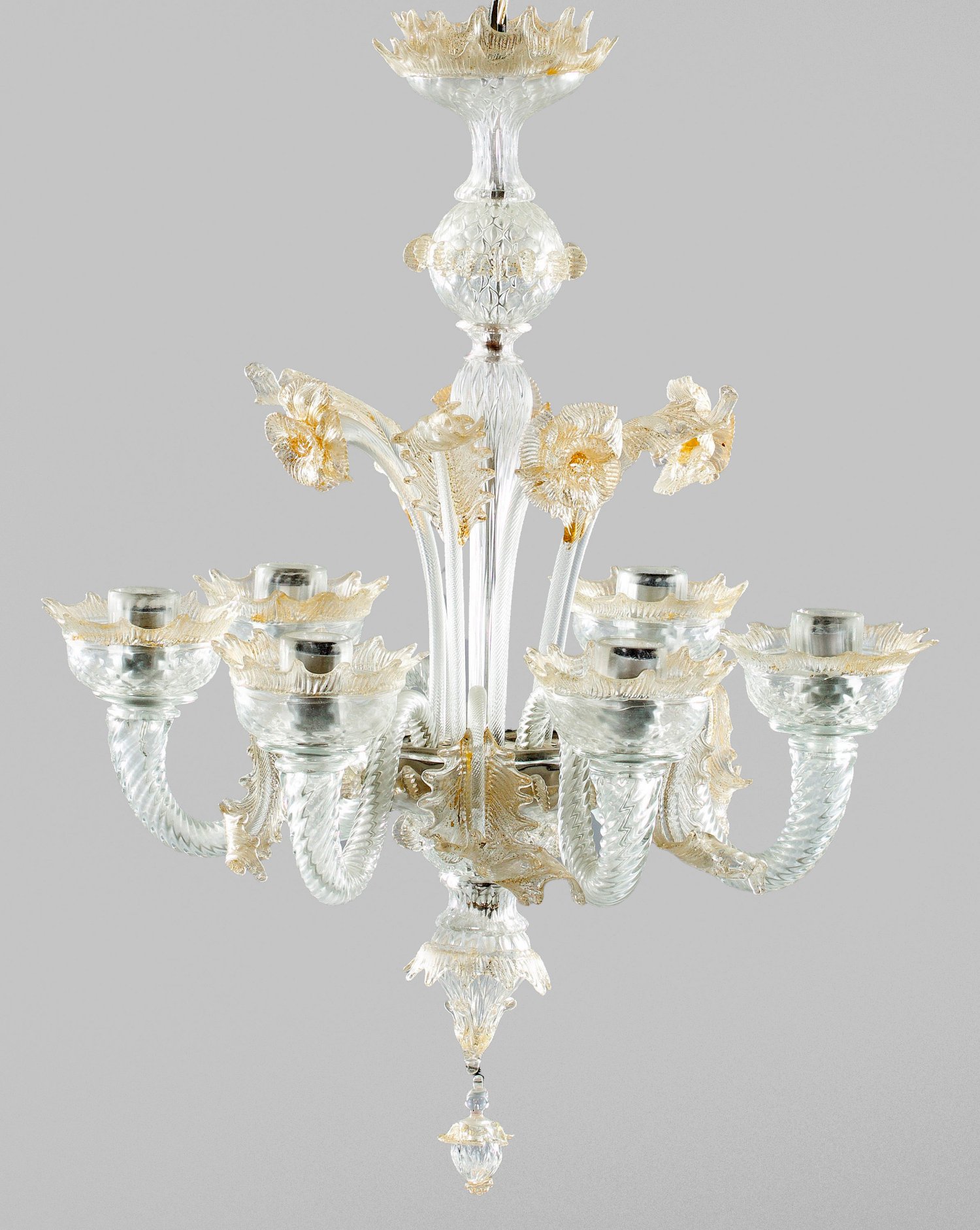 6-flg.; Farbloses Muranoglas mit Goldflitter-Einschmelzungen. Mehrfach gegliederter Balusterschaft. Unterhalb davon ausgehend stark geschwungene Leuchterarme mit tief gemuldeten Traufschalen als Träger für Leuchtmittel. Dekor aus üppigem Blattwerk und Blüten. Elektrifiziert. H. 50 cm. D. 50 cm.