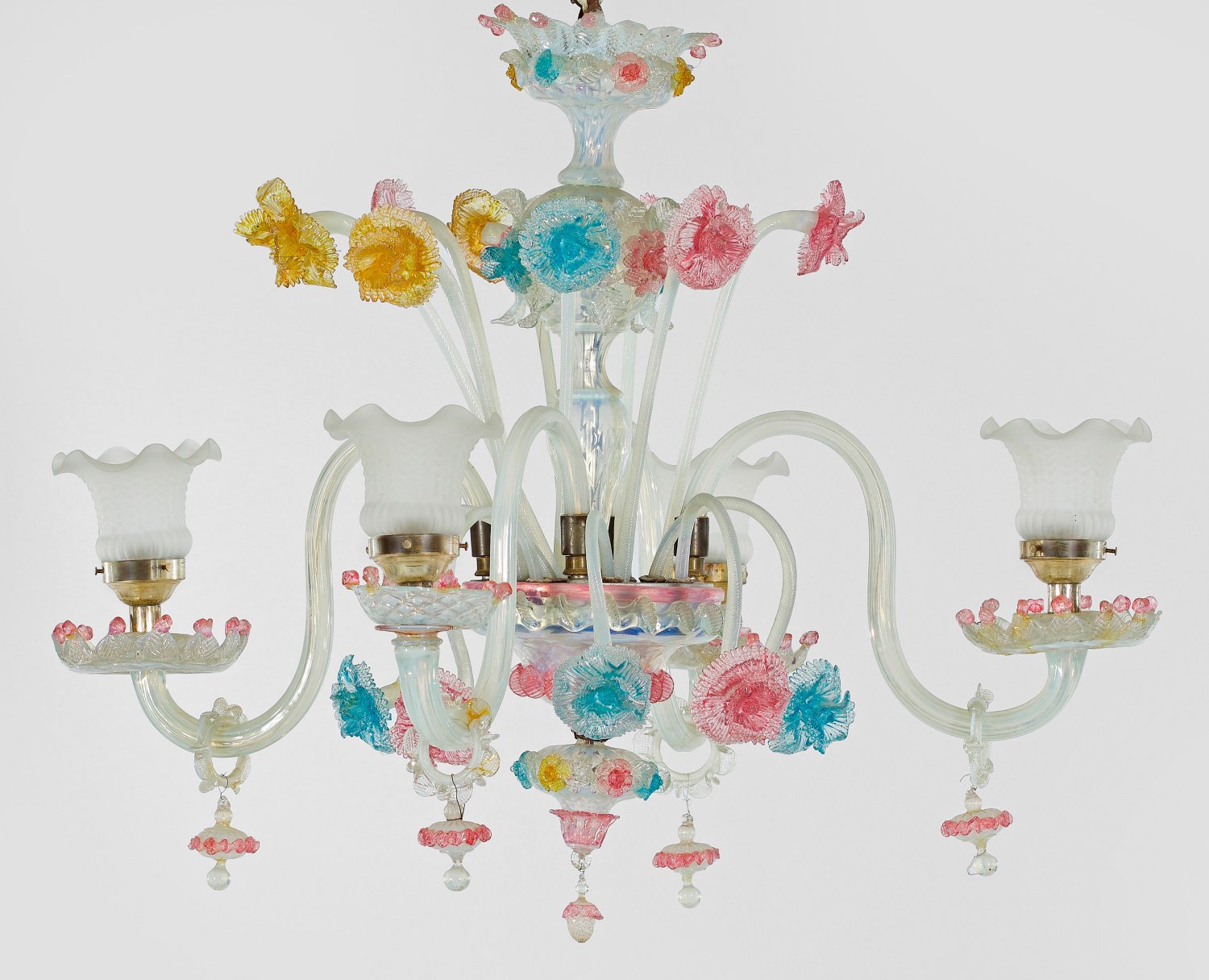 4-flg.; Opalisierendes, hellblaues, gelbes und roséfarbenes Muranoglas. Mehrfach gegliederter Balusterschaft. Unterhalb davon ausgehend stark geschwungene Leuchterarme mit großen Traufschalen und satinierten Lampenschirmen. Dekorationen aus geschwungenen Blütenstielen. Besch.; Unvollständig. Elektrifiziert. H. 70 cm. D. 80 cm.