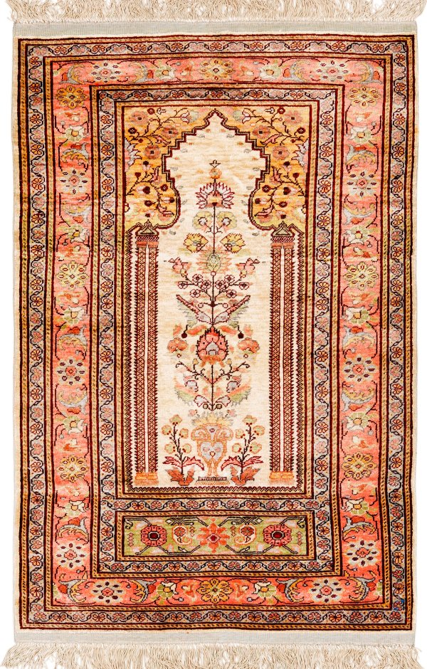 Türkei. Seide auf Seide. Im cremefarbenen Innenfeld architektonisch gegliederte Nische sowie flächendeckende Musterung mit einem Blütenzweig. Umlaufend breite, mehrteilige Bordüre. 100 cm x 66 cm.