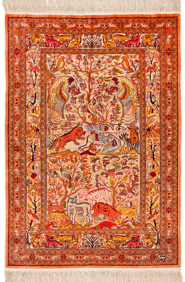 Türkei. Seide auf Seide. Ca. 800.000 Knoten pro qm. Im cremefarbenen Innenfeld flächendeckende Paradiesgartenmusterung mit unterschiedlichen Wildtieren und Vögeln. Umlaufend breite, korrespondierende Hauptbordüre, begrenzt von schmalen Bändern. Sign.; 132 cm x 90 cm.