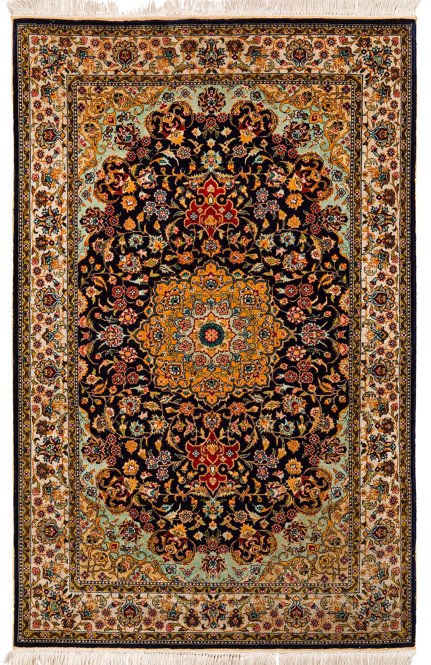 Seide auf Seide. Ca. 850.000 Knoten pro qm. Im dunklen Innenfeld großes, safranfarbenes Zentralmedaillon mit Anhängern sowie türkisfarbene Ecklösungen. Flächendeckende Musterung aus Rankenwerk. Umlaufend breite cremefarbene Bordüre mit Palmettenmuster. 124 cm x 78 cm.