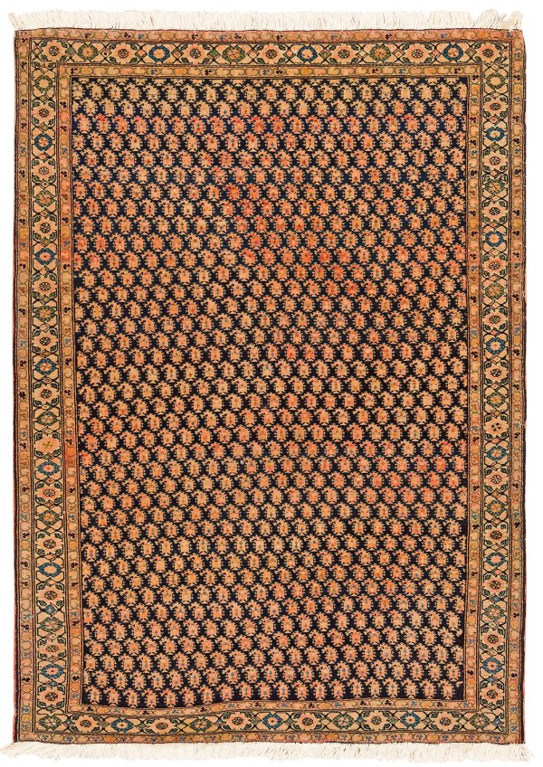 Persien. Um 1920. Wolle auf Baumwolle. Auf dunklem Fond flächendeckende Musterung aus dicht angeordneten Bothéblüten im Rapport. Umlaufend schmale Rosettenbordüre. Fransen erneuert. 153 cm x 109 cm.
