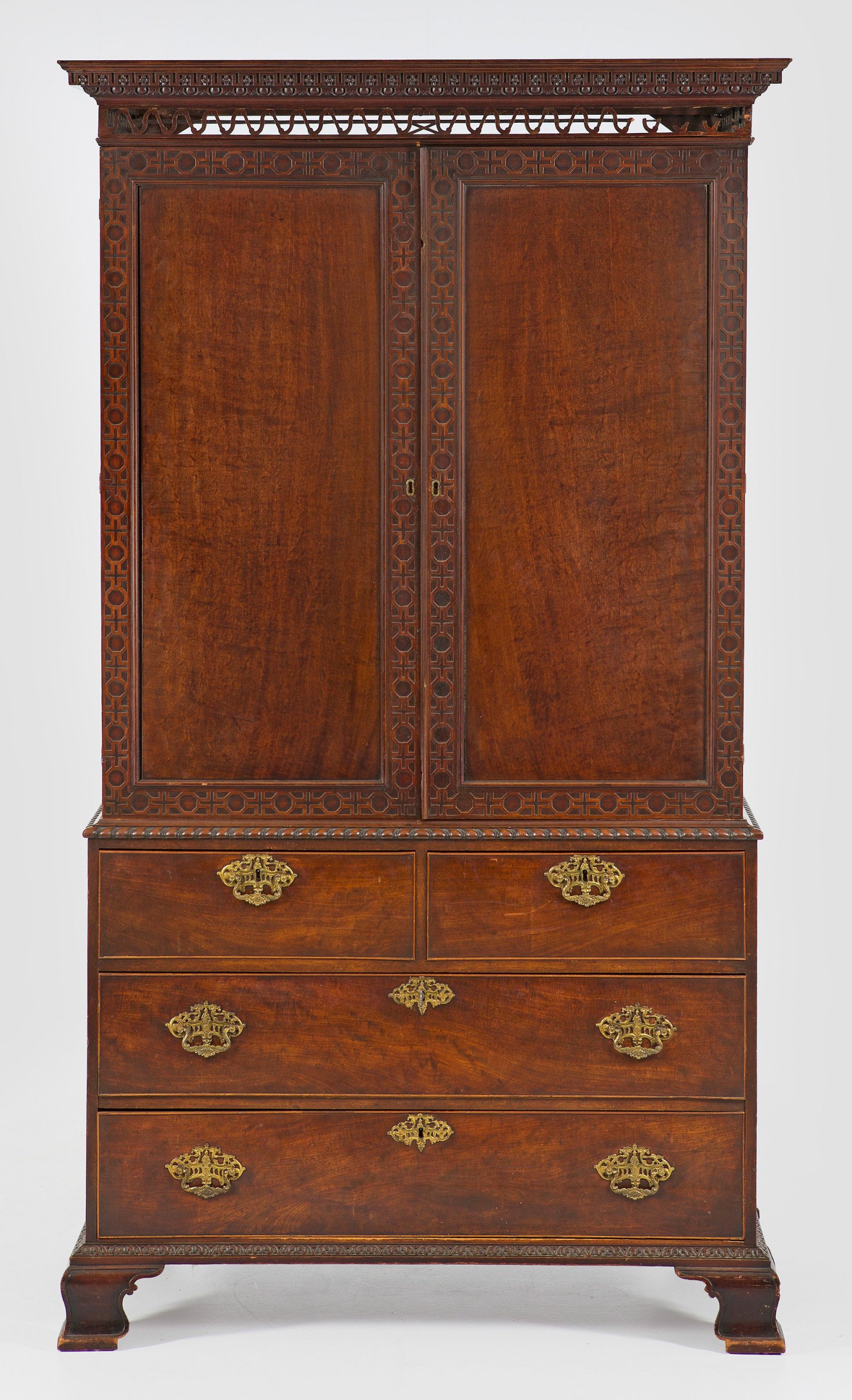 Mahagoni, furniert. Gerader, querrechteckig angelegter Korpus auf schmaler reliefierter Zarge und breiten, geschwungenen Füßen. In der gegliederten Front vier Schubladen unterschiedlicher Größe. Oberhalb korrespondierender zweitüriger Aufsatz mit breitem Ornamentfries. Innen variable Facheinteilung. Ornamental durchbrochen gearbeitetes und vorkragendes Profilgesims, teilw. besch.; Durchbrochen gearbeitete Bronzebeschläge mit Chinoiserien. H. 224 cm. 126 cm x 64 cm.
