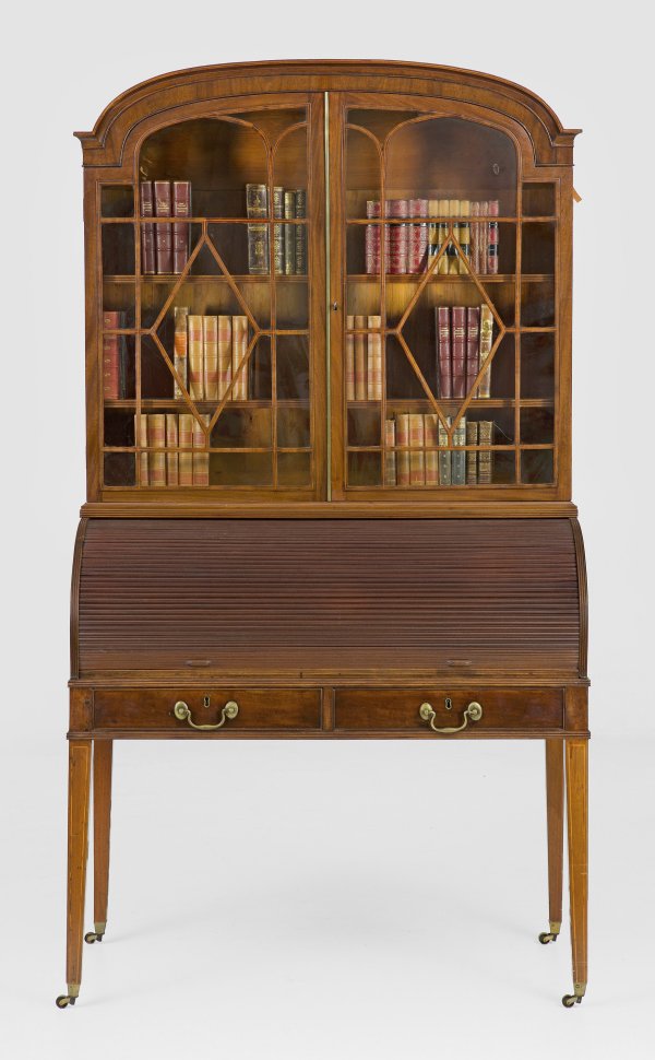Mahagoni. Gerader, zweischübiger Zargenkasten auf hohen, konischen Vierkantbeinen mit Messingrollen. Oberhalb bombierter Zylinderverschluss mit ausziehbarer, mit hellblauem Filz bespannter Arbeitsfläche. Dahinter gestaffelte Facheinteilung. Korrespondierender, zweitürig sprossenverglaster Vitrinenaufsatz mit segmentförmigem Profilabschluss. H. 206 cm. 112 cm x 55 cm.