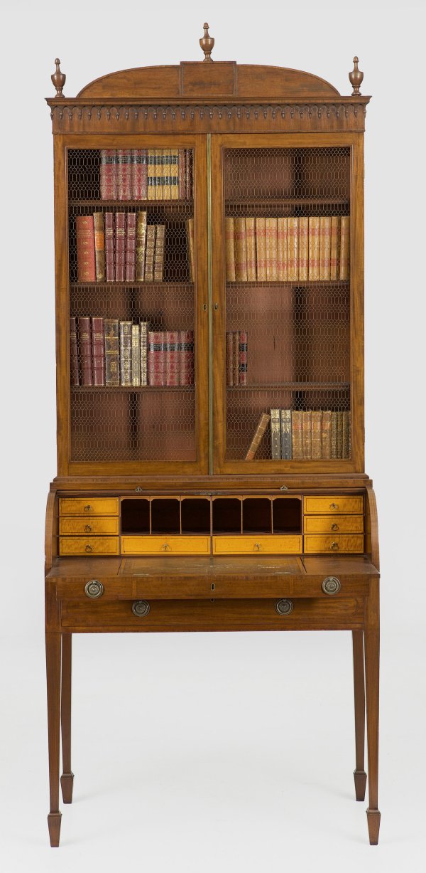 Mahagoni. Gerader Zargenkasten auf hohen, konischen Vierkantbeinen. In der gegliederten Front breites Schubfach sowie bombierter Rolloverschluss und ausziehbare Arbeitsfläche mit pultartig aufstellbarem Mittelteil. Dahinter gestaffelte Facheinteilung. Hochrechteckiger, zweitüriger Aufsatz mit Drahtgitter sowie segmentförmigem oberen Abschluss mit Balusterbekrönungen. H. 236 cm. 96 cm x 52 cm.