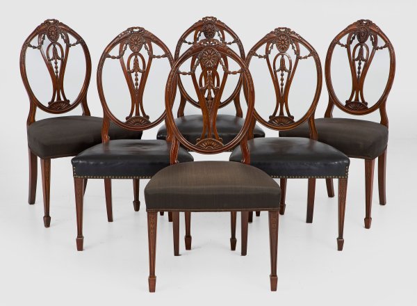 Mahagoni. Trapezförmige Zarge auf konischen, blattreliefierten Vierkantbeinen. Medaillonförmige Rückenlehne mit durchbrochen gearbeitetem Mittelsteg, reliefplastischen Festons und Schleifenbekrönung. Sitzflächen gepolstert und mit schwarzem Leder bzw. Rosshaar bezogen. Sitz-H. 46 cm.