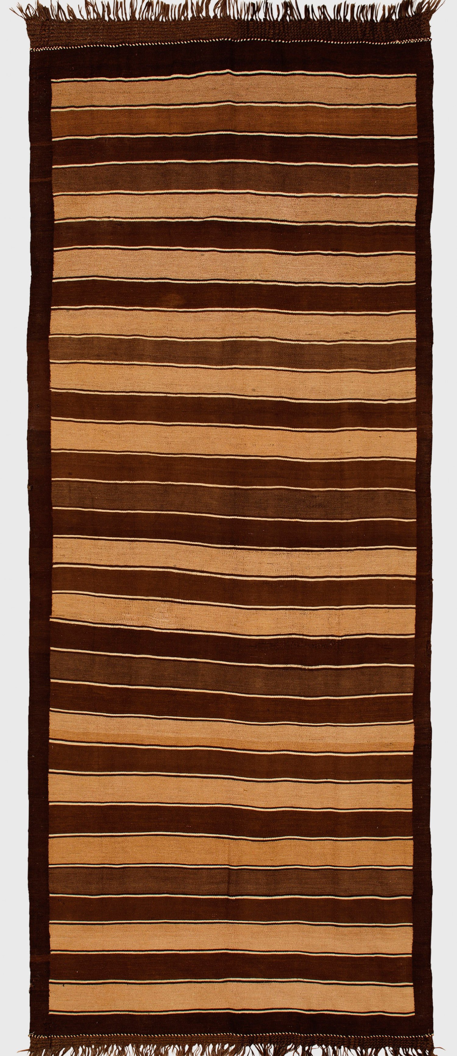 Türkei. Anatolien. Wolle auf Wolle, flach gewebt. Im Innenfeld flächendeckende Streifenmusterung in unterschiedlichen Braun- und Beigetönen, begrenzt von schmalen Borten. Umlaufend monchrome Rahmung. 405 cm x 153 cm.