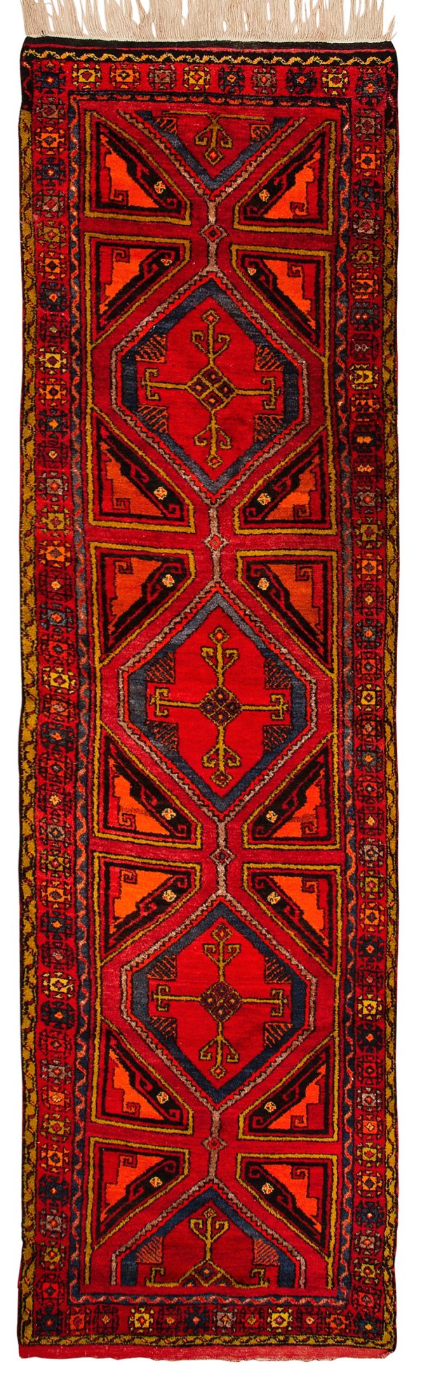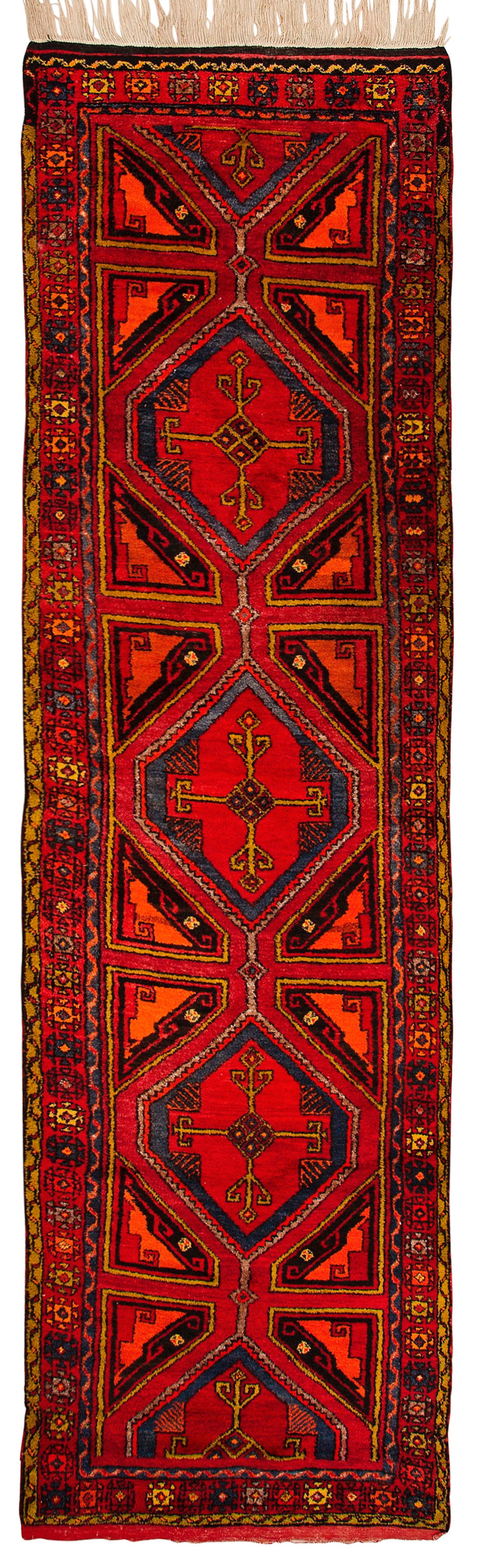 Türkei. Anatolien. Wolle auf Wolle. Im roten Innefeld flächendeckende Musterung aus großen, gereihten Rautenmotiven. Umlaufend breite Rosettenbordüre, begrenzt von schmalen Bändern. 400 cm x 110 cm.