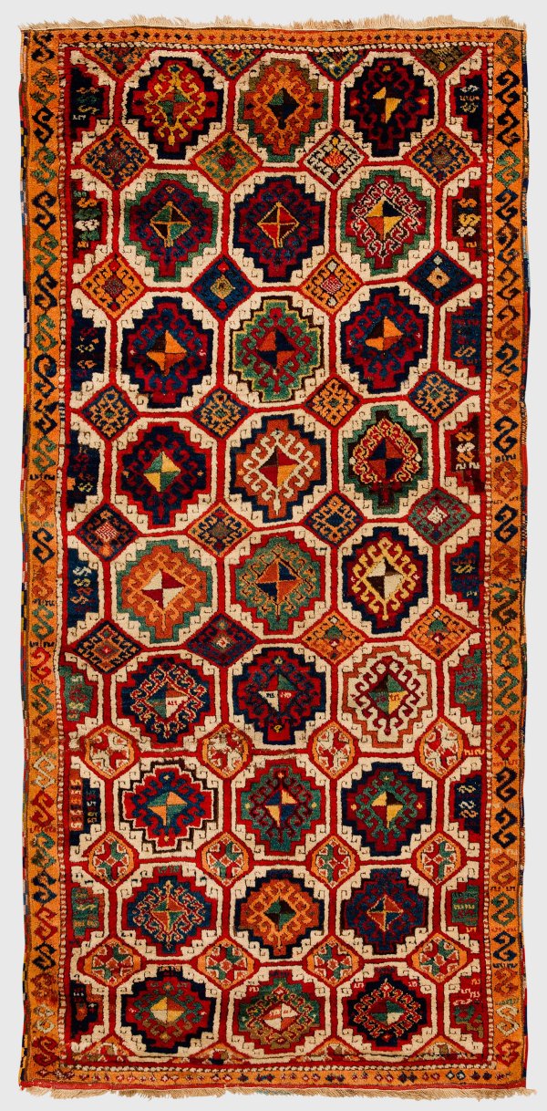 Türkei. Wolle auf Wolle. Im Innenfeld flächendeckende, durchlaufende Musterung aus unterschiedlichen, durch schmale Bänder verbundene Rautenmotive und korrespondierend gemusterten Reserven im Rapport. Umlaufend schmale, safranfarbene Bordüre. Besch.; 228 cm x 109 cm.