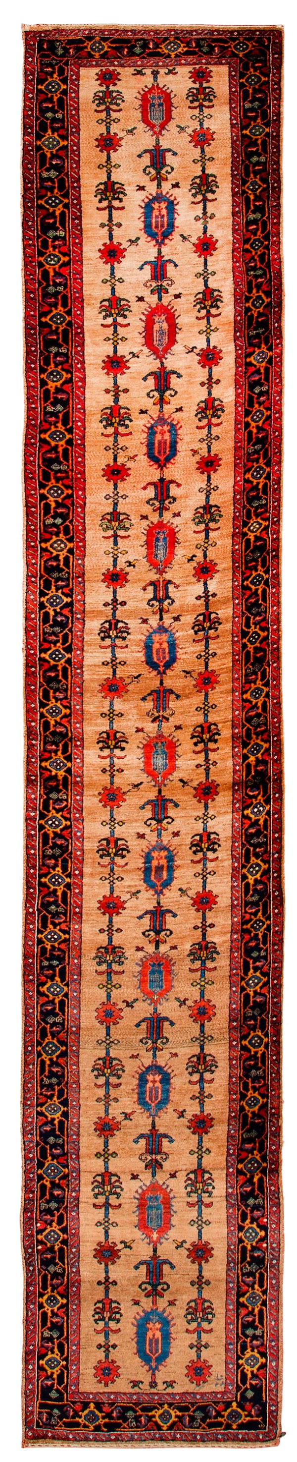 Persien. Wolle auf Baumwolle. Im karamellfarbenen Innenfeld flächendeckende Musterung aus gereihten Palmettenblüten und durch schmale Stege verbundene Rosettenmotive. Umlaufend dunkelgrundige Bordüre aus stilisiertem Rankenwerk. 483 cm x 81 cm.
