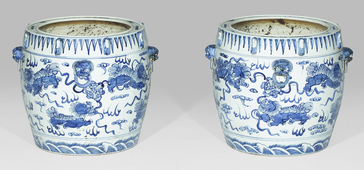 Porzellan mit unterglasurblauem Dekor. Bombierter Korpus, umgeben von erhaben reliefierten Löwenmaskarons. Umlaufend der Wandung flächendeckende Darstellung aus stilisierten Löwen. H. 40 cm.