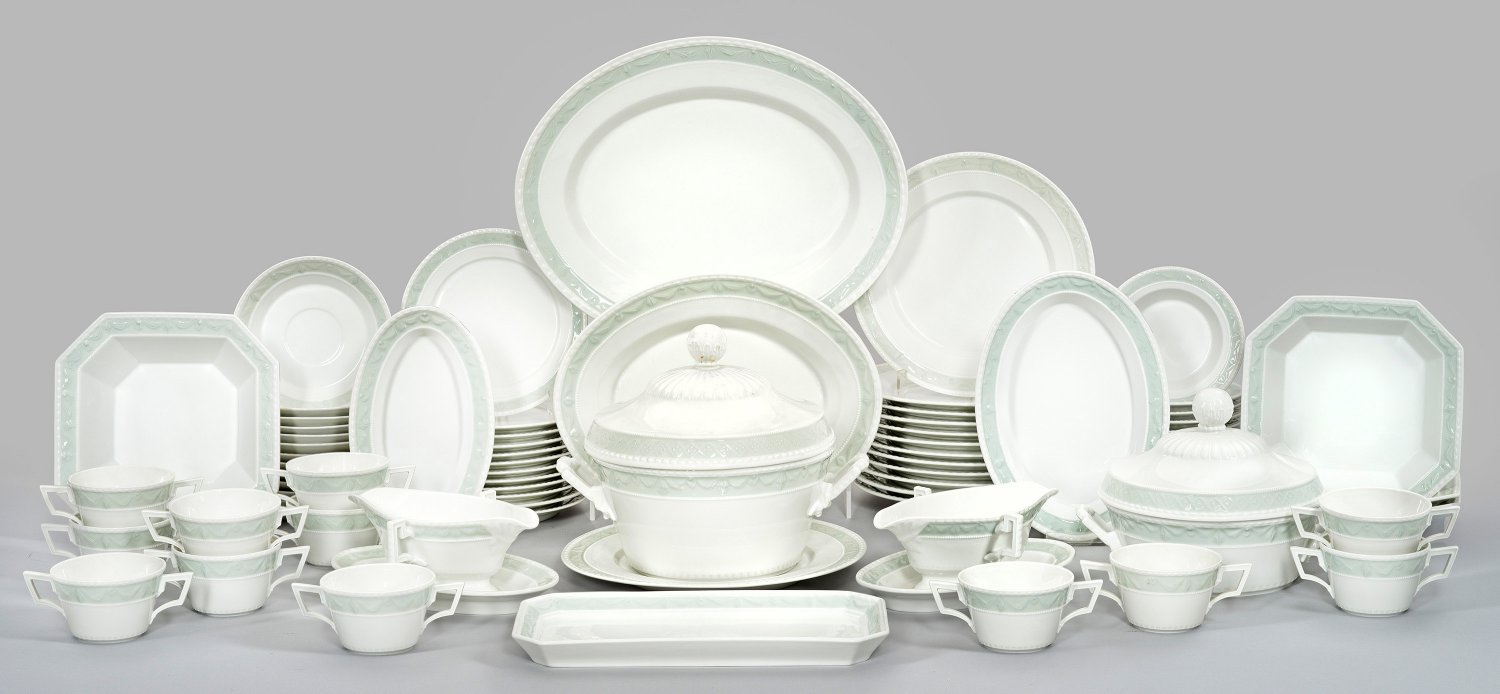 für 12 Personen. 62-tlg.; 12 Speise-, 12 Kuchenteller, 12 Suppen- mit Untertassen, 12 Dessertschälchen, 2 Saucieren, Terrine, Suppenterrine, Presentoire, 3 flache und 1 tiefe Beilagenschale, kleine, mittlere und große Anbietplatte, Bratenplatte, Königskuchenplatte. Auf Wandung, Deckel und Fahne umlaufend feine Bordüre mit reliefierten Perlstäben und Tuchgehängen vor seladongrünem Fond. 2 Teile minim. best., teilw. minim. ber.; Zeptermarke. Suppenterrinen-H. 24 cm. Teller-D. 15,5 - 25 cm. Platten-L. 24 cm – 41 cm.