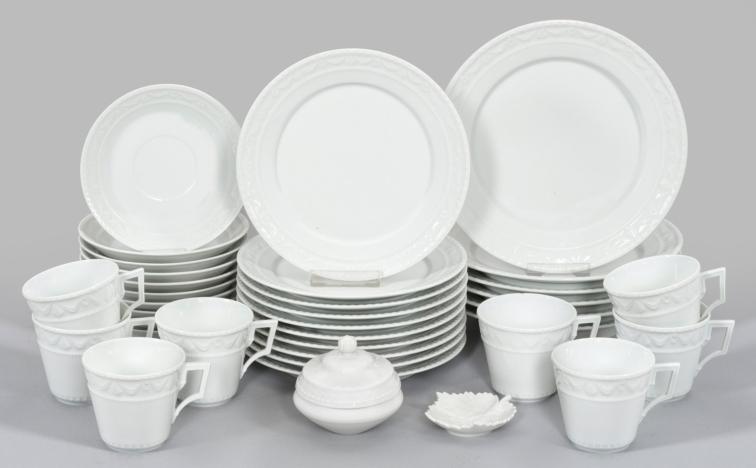 Weißporzellan. 28-tlg.; 6 Dessert-, 10 Kuchenteller, 8 Tassen mit 10 Untertassen, Zuckerdose und Blattschale. Sog. "Kurland" (bzw. "Kurländer Muster"). Klassizistische Form mit feinem Reliefdekor. Umlaufende Bordüre mit Perlschnur und Tuchgehänge. Zeptermarke. Teller-D. 20 cm - 22,5 cm. Blattschale-L. 8 cm.