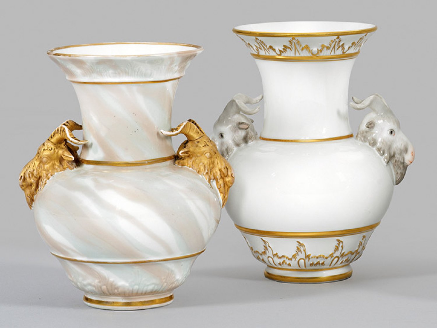 Gedrückt bauchiger, von Blattreliefbordüren umzogener Korpus mit gerundeter Schulter, abgesetztem, langem Hals und ausschwingendem Lippenrand. Seitlich ansetzende, plastische Widderköpfe als Handhaben. Teilw. Marmor imitierender Fond. Polychrome Malerei mit Goldstaffage. Partiell ber.; Zepter- und Malereimarke. H. 17,5 cm - 18 cm.