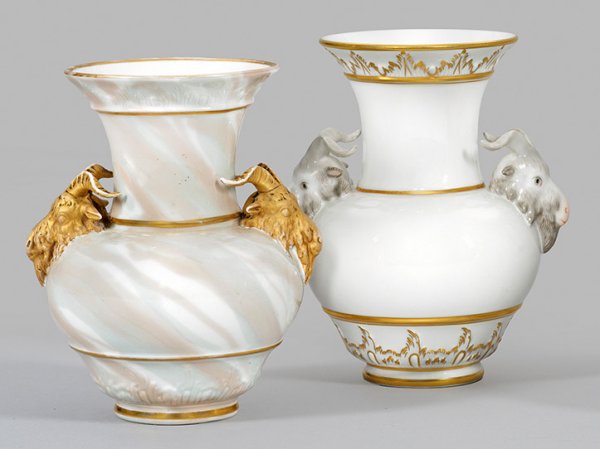 Two porcelain ram's head vases. Partly rubbed. Sceptre- and painter's mark.