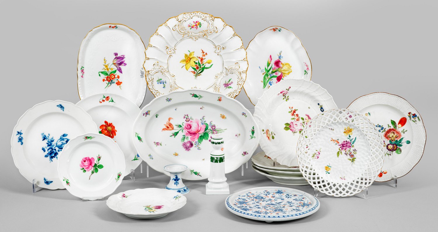 30-tlg. 10 Teile Meissen, 4 Teile Alt-Wien, KPM Berlin und Rauenstein. 7 Speiseteller, 3 ovale Anbietplatten, 2 Kuchenteller, Prunkschale, Durchbruchteller, Rundplatte, Kerzenleuchter. Verschiedene Formen und Blumendekore. Teller mit blauer Blume und Schmetterlingen aus einem Service für Kaiser Wilhelm II. Polychrome Malerei. Teilw. Goldstaffage. Ber.; Wenige Teile minim. best./rest.; Schwertermarke, Zepter- und Malereimarke mit Besitzermarke von Wilhelm II. sowie Manufakturmarken. Teller-D.17,5 cm - 29 cm. Platte max. 35 cm x 25 cm.