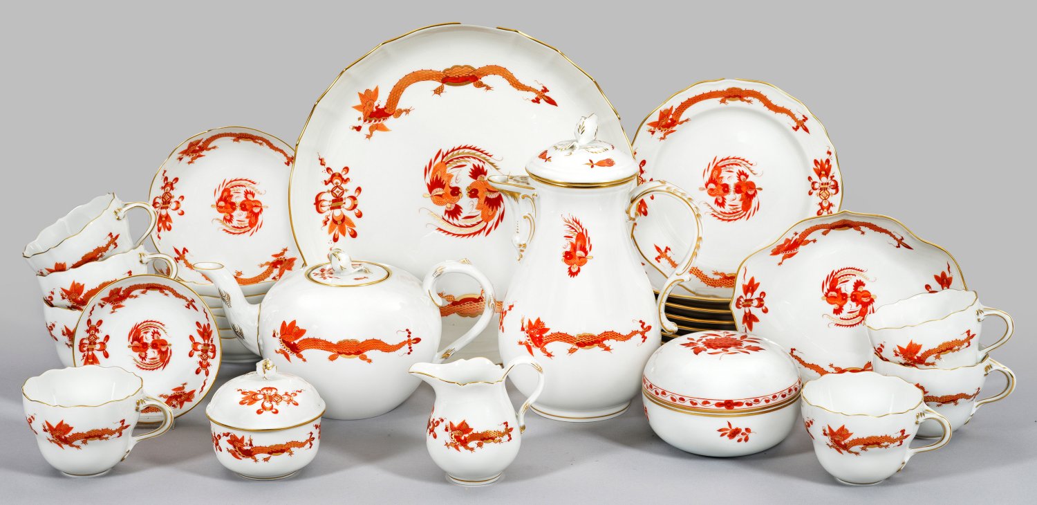 21-tlg.; Kaffeekanne, Teekanne, Sahnekännchen, Zuckerdose, 7 Kaffeetassen mit Untertassen, 7 Dessertteller, große Anbietschale, kleines Rundschälchen, Vierpassschale, als Zugabe Bonbonniere mit Dekor "Indische Koralle". Form "Neuer Ausschnitt" mit Asthenkel. Plastische Deckelrosen. Dekor "Reicher Drache" in eisenroter, goldschattierter Camaieumalerei. Goldrand. Deckelrosen minim. best.; Schwertermarke.