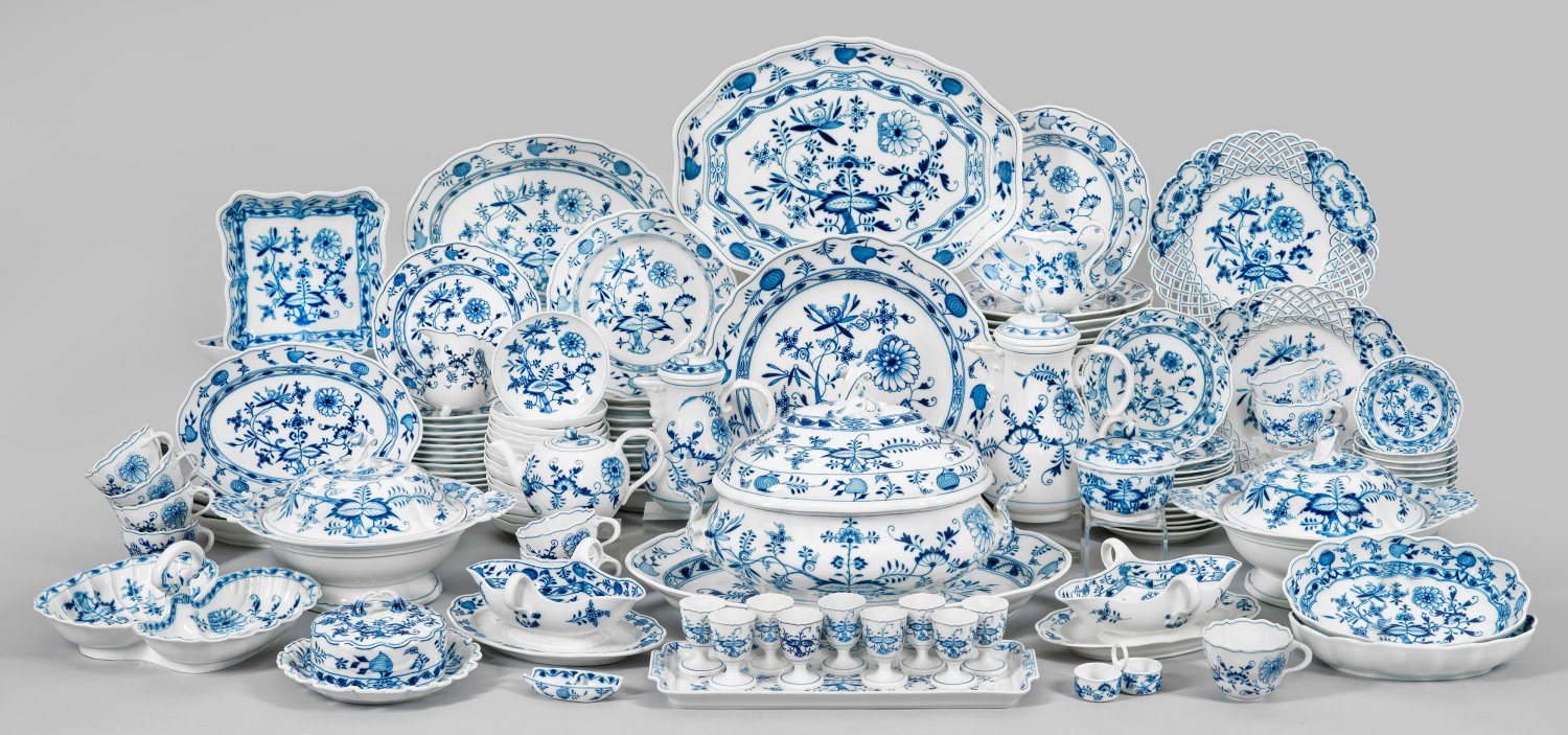 130-tlg.; 24 Speiseteller, 12 Suppenteller, 14 Vorspeiseteller, 13 Dessertteller, 9 Kaffeetassen mit Untertassen, 9 Eierbecher, 6 Kaffeeuntertasssen, 10 verschieden große Anbiteplatten, 12 Rundschälchen, 2 Sahnegießer, 2 Durchbruchteller, 2 Gemüseschalen, 2 Saucieren, 2 Schälchen mit gewelltem Rand, 2 große Deckelschüsseln, 2 Gewürzschalen, Kaffeekanne, Mokkakanne, Teekanne, Zuckerdose, Butterglocke, Cabaret-Schale, große Deckelterrine. Unterglasurblauer Zwiebelmusterdekor. Wenige Teile best./rest; Schwertermarke. Größte Platte 48 cm x 35 cm. Kaffeekanne 26,5 cm. Speiseteller-D. 24 cm.