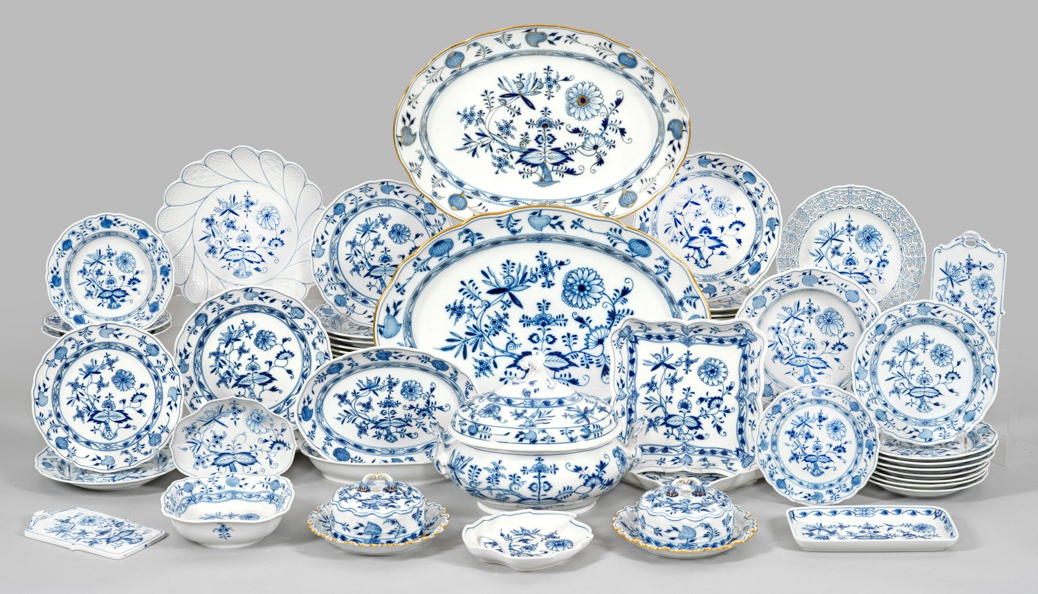 78-tlg.; 45 Speiseteller, 5 Suppenteller, 8 Vorspeiseteller, 3 vertiefte Beilagenteller, Durchbruchteller, große Deckelterrine, kleine flache Platte, 2 Butterglocken, 2 längsovale Anbietschalen, 2 Brettchen, Vierpassschale, vertiefte Beilagenschale, Blattschale, 2 viereckige Beilagenschalen, Teller mit Waffelmuster, 2 große Servierplatten. Unterglasurblauer Zwiebelmusterdekor. 4 Teile mit Goldstaffage. Wenige best.; Schwertermarke. Speiseteller D. 23,5 cm - 25 cm. Terrine H. 24 cm. 32 cm x 20 cm. Große Platten max. 52,5 cm x 38 cm.