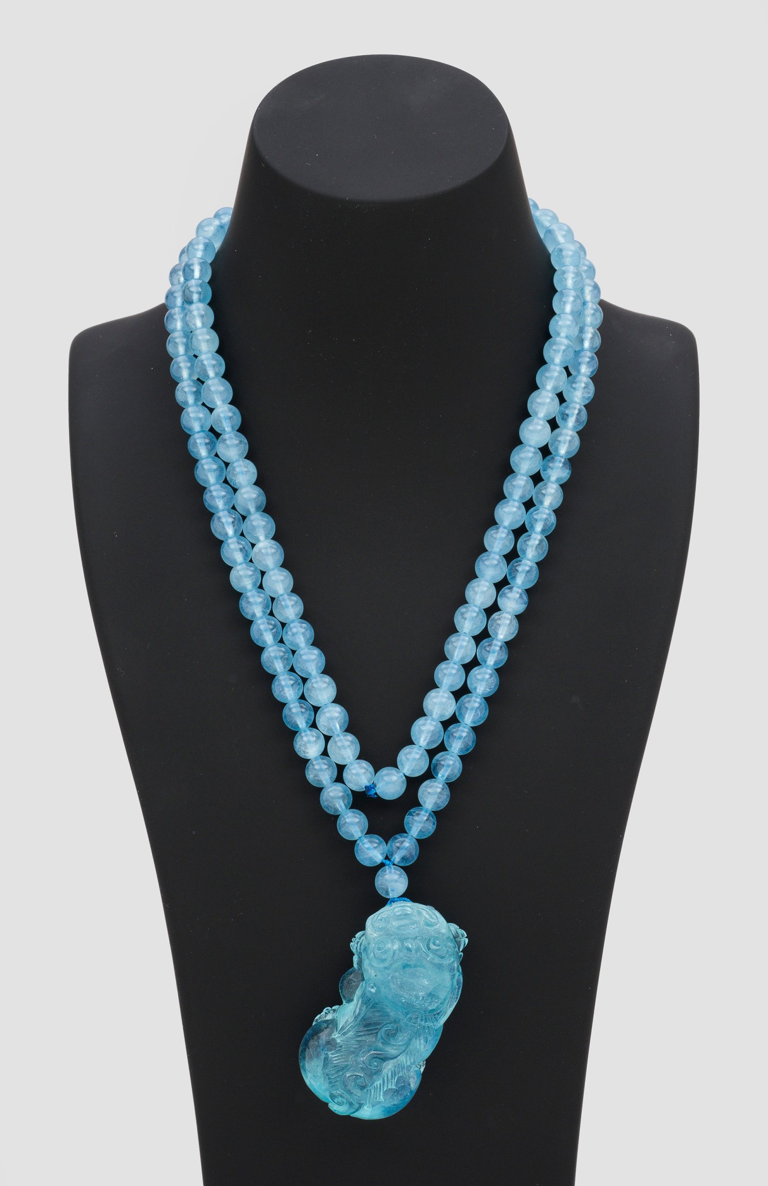 Einreihige Kette aus himmelblauen Aquamarin-Perlen von ca. 5 mm, korrespondierender Aquamarin-Anhänger mit geschnitztem Löwenhund. L. ca. 47 cm. Ges.-Gew. ca. 107,79 g.
