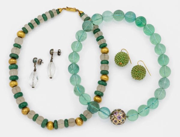 Zwei Colliers und zwei Paar Ohrgehänge. Silber, gest. 925, teilw. vergoldet. Besetzt mit Glasperlen. Ges.-Gew. ca. 339,37 g.