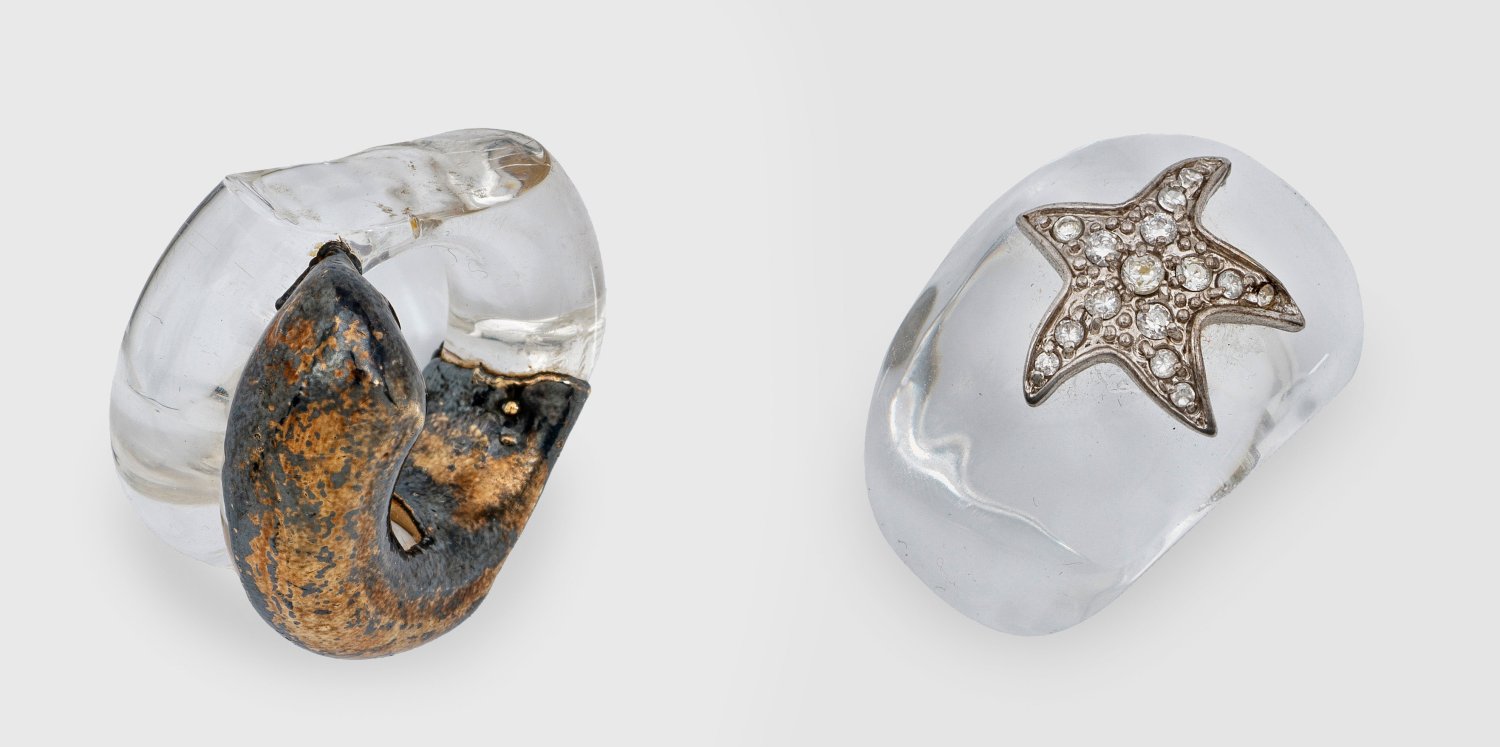 Two rings in acrylic glass, set with diamonds approx. 0,30 ct. and silver.