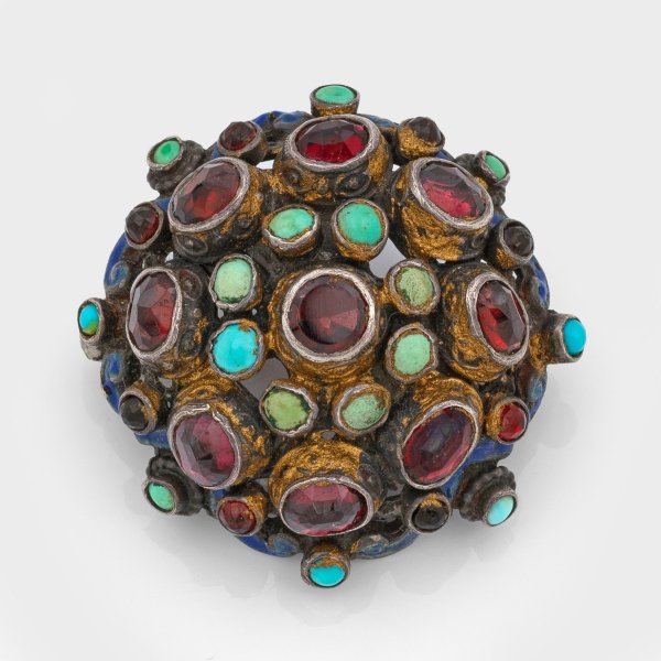 Silber, teilw. farbig emailliert. Rosettenförmig, schauseitig besetzt mit Granaten und Türkisen. Gew. ca. 17,56 g.
