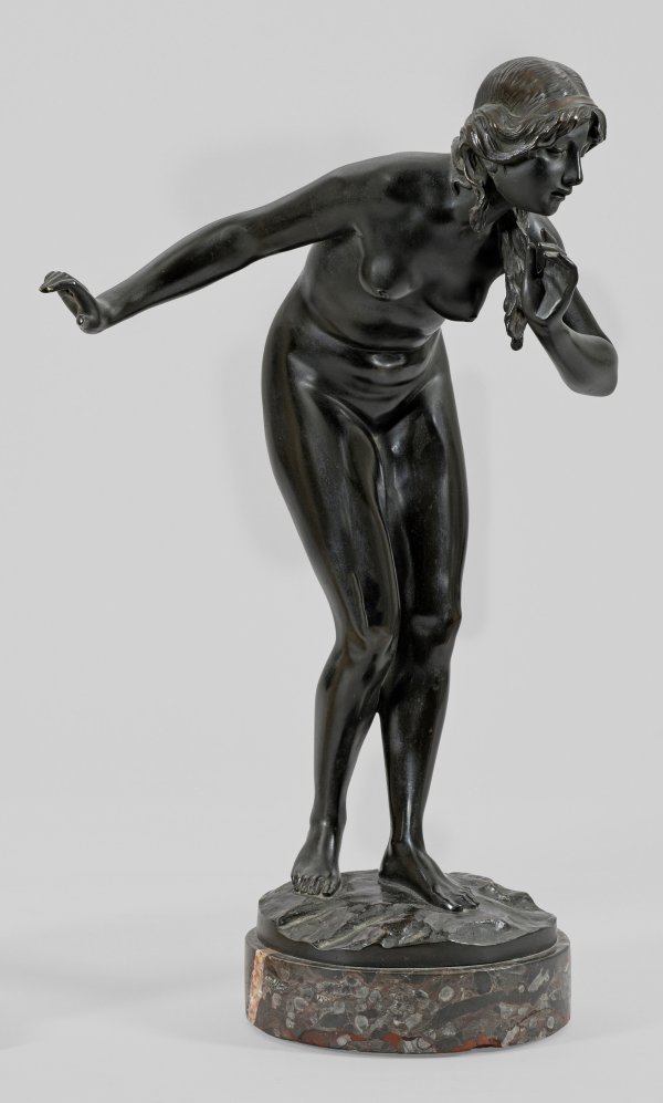 Bronze, dunkel patiniert. Sign.; Marmorsockel. Auf einer gerundeten Naturplinthe stehender Akt eines Mädchens, sich vorsichtig lauschend vorbeugend. Reizvolle Jugendstil-Statuette Götzes, der in Leipzig u.a. bei Melchior Anton zur Straßen studierte und 1897 in Berlin ansässig wurde. Götze zeigte seine Büsten und Kleinbronzen regelmäßig auf der Großen Berliner Kunstausstellung. Von der "Lauscherin" gab es auch Versionen als Halbakt. Untere Sockelkante best.; Bronze-H. 42,8 cm; Ges.-H. 47 cm.
