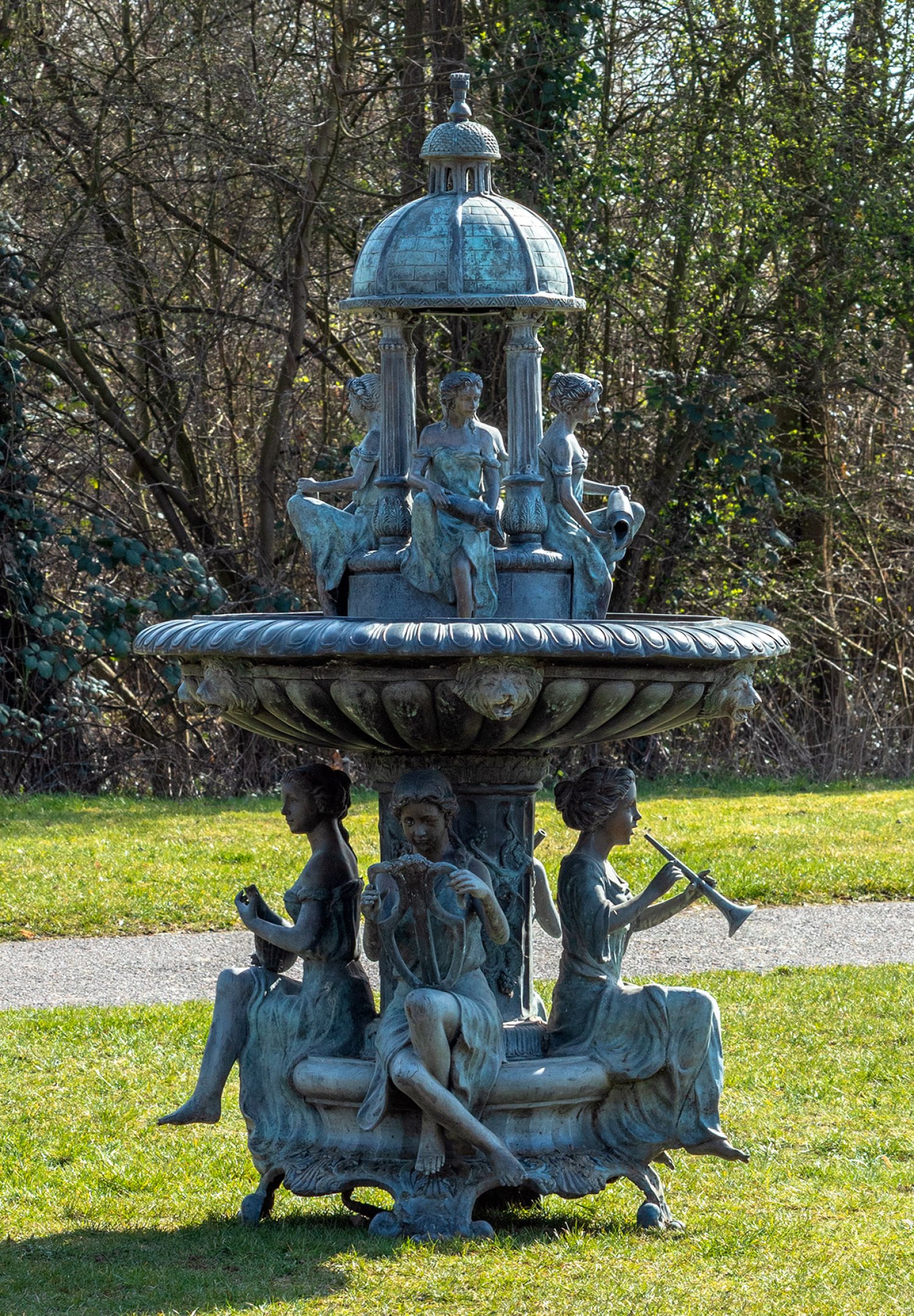 Bronze, patiniert. Über geschweift ansteigender Basis, zylinderförmiger, kannelierter Schaft mit reliefierten Weinreben, umgeben von vollplastisch gestalteten musizierenden Kinderfiguren als Träger für tiefgemuldete, godronierte Brunnenschale mit plastischen Löwenmaskarons und beitem Lippenrand mit Zungenfries. Oberhalb architektonisch gegliederter Pavillon aus Balustersäulen und kuppelförmigem oberen Abschluss sowie vollplastisch gestaltete weibliche Figuren mit Amphoren. H. 225 cm. D. 135 cm.