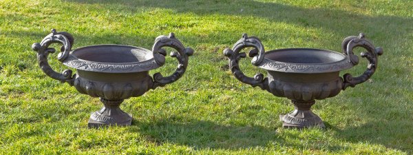 Gusseisen. Über quadratischer Plinthe gedrückter, umlaufend godronierter Korpus mit breitem, weit vorkragendem, reliefiertem Lippenrand. Stark geschwungene Henkel aus üppigen Blattvoluten. H. 45 cm.