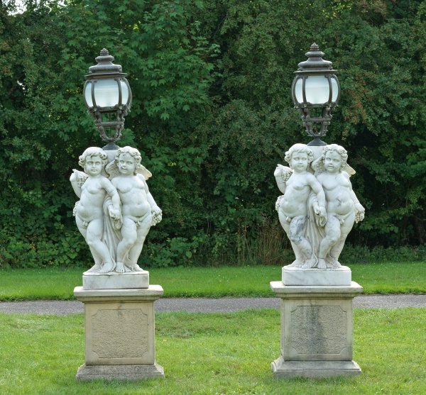 1-flg.; Weißer, teilw. hellgrau gemaserter Marmor, patinierte Bronze, satiniertes Glas und Gussstein. Über quadratischer Plinthe drei um einen Säulenschaft gruppierte, vollplastisch gestaltete Amoretten mit Weinreben sowie üppig gefüllten Traubenkörben. Oberhalb balusterförmige Laterne aus schmalen, gegeneinander gestellten Voluten und stark bombierten Glaseinsätzen. Gestuft ansteigender oberer Dachabschluss mit Balusterbekrönung. Elektrifiziert. Unterhalb hoher Podestsockel mit profilierter Basis, flach kassettierten Füllungen sowie korrespondierender Deckplatte. Ges.-H. 255 cm.