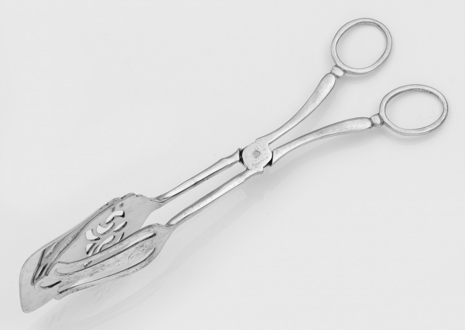 Gebäckzange Silber. Scherenförmig mit durchbrochen gearbeiteten Greifern. Gest. 880. Gew. ca. 90 g. L. 20 cm.A German silver pastry tongs. Standard mark 800.Deutsch. 20. Jh.