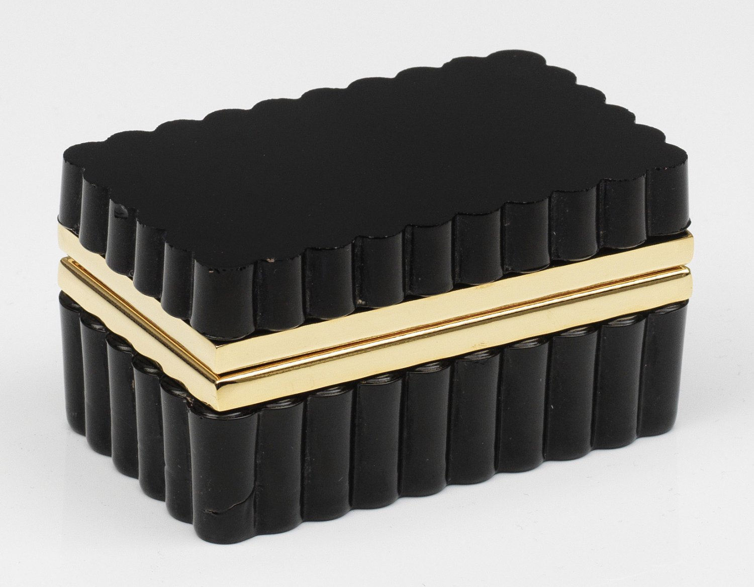 A French Art Deco corrugated cut and polished black glass box and brass-mounted hinged cover. Age-related signs of use.